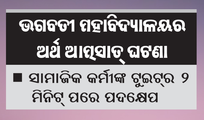 ସୂଚନା ଅନୁଯାୟୀ, ଉଚ୍ଚଶିକ୍ଷାର ପ୍ରସାର ପାଇଁ କୋଣାର୍କ ଅଞ୍ଚଳର ବୁଦ୍ଧିଜୀବୀ ଓ ଶିକ୍ଷାପ୍ରେମୀଙ୍କ ଉଦ୍ୟମରେ ୧୯୭୮ ମସିହାରେ ଭଗବତୀ ମହାବିଦ୍ୟାଳୟ ସ୍ଥାପନ କରାଯାଇଥିଲା। ଏହି ମହାବିଦ୍ୟାଳୟ ପ୍ରତିଷ୍ଠା ହେବାର ଇତିମଧ୍ୟରେ ୪୬ବର୍ଷ ବିତିଗଲାଣି। ଏହାସତ୍ତ୍ୱେ ମହାବିଦ୍ୟାଳୟ ନାମରେ ସ୍ଥାୟୀ ଜମି ରେକର୍ଡଭୁକ୍ତ ହୋଇପାରିନାହିଁ। ଫଳରେ ମହାବିଦ୍ୟାଳୟକୁ ବିଶ୍ବବିଦ୍ୟାଳୟ ଅନୁଦାନ ଆୟୋଗ ମଞ୍ଜୁରୀ ମିଳିପାରୁ ନ ଥିବା ବେଳେ ଏହାର ପାରିପାଶର୍ବିକ ବିକାଶ କାର୍ଯ୍ୟ ବାଧାପ୍ରାପ୍ତ ହେଉଛି। ମହାବିଦ୍ୟାଳୟର ତତ୍କାଳୀନ ଅଧ୍ୟକ୍ଷ ବିଷ୍ଣୁ ପ୍ରସାଦ ମିଶ୍ରଙ୍କ ସମୟରେ କାର୍ଯ୍ୟରତ ଜଣେ ମହିଳା କିରାଣିଙ୍କ ଦ୍ବାରା ଜାଲ୍ ରସିଦ ମାଧ୍ୟମରେ ୬ଲକ୍ଷ ଟଙ୍କା ଆତ୍ମସାତ କରାଯାଇଥିବା ସମ୍ପ୍ରତି ପୁରାତନ ଛାତ୍ର ସଙ୍ଗଠନ ଅଭିଯୋଗ ଆଣିବା ପରେ ଘଟଣା ଲୋକଲୋଚନକୁ ଆସିଛି। ଏ ସମ୍ପର୍କରେ କଲେଜ କର୍ତ୍ତୃପକ୍ଷ କିଭଳି ଜାଣିପାରି ନ ଥିଲେ ଅଥବା ଜାଣିଶୁଣି ଚପାଇ ଦେବା ପାଇଁ ଉଦ୍ୟମ କରିଥିଲେ ତାହା ତଦନ୍ତ କଲେ ଅସଲ ରହସ୍ୟ ପଦାକୁ ଆସିବା ସହ ଦୁର୍ନୀତିର ପର୍ଦ୍ଦାଫାଶ୍ ହୋଇପାରିବ ବୋଲି ସ୍ଥାନୀୟ ଅଞ୍ଚଳବାସୀ ଦାବି କରିଆସୁଛନ୍ତି। କଲେଜର ପୁରାତନ ଛାତ୍ର ସଙ୍ଗଠନର ଅଭିଯୋଗ ଭିତ୍ତିରେ ଏ ନେଇ ବିଭିନ୍ନ ଗଣମାଧ୍ୟମରେ ଖବର ପ୍ରକାଶ ପାଇଥିଲା। ସମ୍ପୃକ୍ତ କିରାଣିଙ୍କ ବିରୋଧରେ କାର୍ଯ୍ୟାନୁଷ୍ଠାନ ଗ୍ରହଣ ନିମନ୍ତେ ମୁଖ୍ୟମନ୍ତ୍ରୀ, ୫-ଟି ସଚିବ, ମୁଖ୍ୟ ଶାସନ ସଚିବ, ଉନ୍ନୟନ କମିଶନର, ଉଚ୍ଚଶିକ୍ଷା ବିଭାଗ ମନ୍ତ୍ରୀ, ପୁରୀ ଜିଲାପାଳଙ୍କୁ ସାମାଜିକ କର୍ମୀ ସ୍ବାଇଁ ରବିବାର ସକାଳେ ଟୁଇଟ୍ ଯୋଗେ ଅଭିଯୋଗ କରିଥିଲେ। ଟୁଇଟ୍ର ମାତ୍ର ଦୁଇ ମିନିଟ ମଧ୍ୟରେ ମୁଖ୍ୟ ଶାସନ ସଚିବ ଜେନା ଏହି ଘଟଣାକୁ ଗୁରୁତ୍ୱର ସହ ନେଇ ଉଚ୍ଚଶିକ୍ଷା ବିଭାଗ ଓ ପୁରୀ ଜିଲାପାଳଙ୍କୁ ତଦନ୍ତ ନିର୍ଦ୍ଦେଶ ଦେଇଛନ୍ତି। ଉଲ୍ଲେଖଥାଉ କି, ତୁରନ୍ତ ଏହି ଘଟଣାର ତଦନ୍ତ କରି ସମ୍ପୃକ୍ତ କିରାଣିଙ୍କ ବିରୋଧରେ ଦୃଢ ଆଇନଗତ କାର୍ଯ୍ୟାନୁଷ୍ଠାନ ଗ୍ରହଣ କରିବା ପାଇଁ ସାମାଜିକ କର୍ମୀ ସ୍ବାଇଁ ଦାବି କରିଥିଲେ।