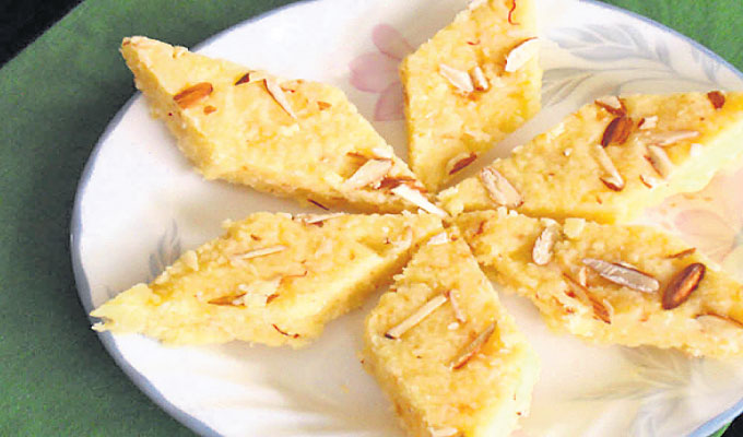 ପାଣି-୧କପ୍, ଚିନି-୧କପ୍, କୋରା ନଡ଼ିଆ-ଦେଢ଼ କପ୍, ଖୁଆ- ଅଧା ଚାମଚ, କଟା ବାଦାମ-୫ଟି, ଆଲ୍ମଣ୍ଡ-୬ଟି, ଗୁଜୁରାତି ଗୁଣ୍ଡ-୧ଚାମଚ, ଘିଅ-୧ଚାମଚ।