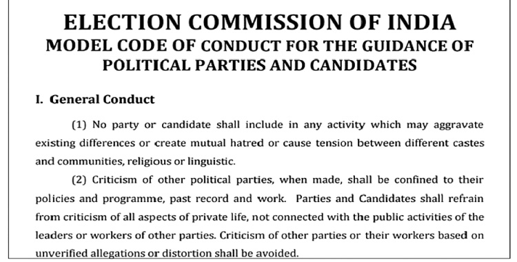 ନୂଆଦିଲ୍ଲୀ,୧୭ା୩ଭାରତର ନିର୍ବାଚନ ଆୟୁକ୍ତ (ଇସିଆଇ) ଶନିବାର ଅପରାହ୍ନ ୩ଟାରେ ଲୋକ ସଭା ଓ ୪ ରାଜ୍ୟ ବିଧାନସଭା ନିର୍ବାଚନ ତାରିଖ ଘୋଷଣା କରିବା ପରେ ତତ୍କାଳ ସାରା ଦେଶରେ ଆଦର୍ଶ ଆଚରଣ ବିଧି (ଏମ୍ସିସି) ଲାଗୁ ହୋଇଛି। ଏହି ଆଚରଣ ବିଧି ପ୍ରଥମେ ୧୯୬୦ରେ କେରଳ ବିଧାନସଭା ନିର୍ବାଚନ ବେଳେ ଲାଗୁହୋଇଥିଲା। ରାଜନୈତିକ ଦଳଗୁଡ଼ିକର ଆଚରଣ କିପରି ରହିବା ଉଚିତ ସେନେଇ ପ୍ରଶାସନ ପକ୍ଷରୁ ନୀତି ନିର୍ଦ୍ଧାରଣ କରାଯାଇଥିଲା।