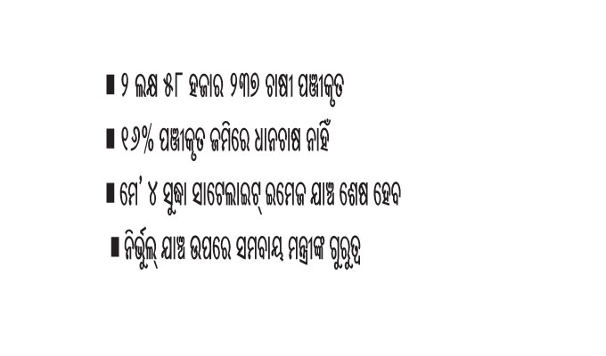 ଚଳିତ ରବିଧାନ ସଂଗ୍ରହ ରାଜ୍ୟର ୧୭ଟି ଜିଲାରେ କରାଯାଉଥିବା ବେଳେ ପ୍ରକୃତ ଧାନଚାଷ କରାଯାଇଥିବା ଜମିର ସର୍ଭେ କାର୍ଯ୍ୟ ସାଟେଲାଇଟ୍ ଇମେଜରି ମାଧ୍ୟମରେ କରାଯାଉଛି ା ମେ’ ୪ ତାରିଖ ସୁଦ୍ଧା ଓର୍ସାକ୍ ଦ୍ୱାରା ସମସ୍ତ ପଞ୍ଜୀକୃତ ଧାନଚାଷ ଜମିର ସାଟେଲାଇଟ୍ ସର୍ଭେ କାର୍ଯ୍ୟ ଶେଷ କରିବା ପାଇଁ ଖାଦ୍ୟ ଯୋଗାଣ ଓ ଖାଉଟି କଲ୍ୟାଣ, ସମବାୟ ମନ୍ତ୍ରୀ ରଣେନ୍ଦ୍ର ପ୍ରତାପ ସ୍ବାଇଁ ନିର୍ଦ୍ଦେଶ ଦେଇଛନ୍ତି ା ସାଟେଲାଇଟ୍ ଇମେଜରି ମାଧ୍ୟମରେ ମିଳୁଥିବା ତଥ୍ୟ ଅନୁଯାୟୀ ସନ୍ଦିଗ୍ଧ ପ୍ଲଟଗୁଡ଼ିକର କ୍ଷେତ୍ରସ୍ତରରେ ଯାଞ୍ଚ କରାଯାଉଛି ା ସାଟେଲାଇଟ୍ ସର୍ଭେ ଦ୍ୱାରା ମିଳିଥିବା ତଥ୍ୟ ଅନୁଯାୟୀ ପଞ୍ଜୀକୃତ କରିଥିବା ଜମିର ୧୬ ପ୍ରତିଶତ ଜମିରେ ଧାନଚାଷ କରାଯାଇନାହିଁ ା