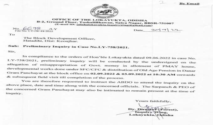 ହାଟଡିହୀ,୧ା୯(ଡି.ଏନ୍.ଏ.): କେନ୍ଦୁଝର ଜିଲା ହାଟଡିହୀ ବ୍ଲକ ଡଅଁର ପଞ୍ଚାୟତରେ ସରକାରୀ ଅନୁଦାନ ଆତ୍ମସାତ ହୋଇଥିବା ନେଇ ଓଡ଼ିଶା ଲୋକାୟୁକ୍ତଙ୍କ ତଦନ୍ତକାରୀ ଦଳ ସେପ୍ଟେମ୍ବର ୨ରେ ବ୍ଲକ କାର୍ଯ୍ୟାଳୟରେ ପହଞ୍ଚି ପ୍ରାଥମିକ ତଦନ୍ତ କରିବେ। ଏ ବାବଦରେ ଲୋକାୟୁକ୍ତଙ୍କ କାର୍ଯ୍ୟାଳୟ ପକ୍ଷରୁ ଜଣାଯାଇଛି। ଚିଠି ନଂ ୬୬୯୯ ଏବଂ ୬୭୦୧/୩୦.୮.୨୨ରେ ପୂର୍ବତନ ପିଇଓ ରମେଶ ମାଝି ଏବଂ ଜିଆରଏସ୍ ବିନୟ ମଲିକଙ୍କୁ ବିଡିଓଙ୍କ ଜରିଆରେ ନୋଟିସ ଜାରି କରାଯାଇଛି। ଉଭୟ ପିଇଓ ଏବଂ ଜିଆରଏସ୍ଙ୍କ ବୟାନ ସଂଗ୍ରହ କରାଯିବ ବୋଲି ନୋଟିସ୍ରେ ଉଲ୍ଲେଖ ରହିଛି। ସେହିପରି ଚିଠି ନଂ ୬୬୯୮/୩୦.୦୯.୨୨ (ତାରିଖକୁ ନେଇ ସନ୍ଦେହ) ଅନୁସାରେ ସେପ୍ଟେମ୍ବର ୨ ଏବଂ ୩ ତାରିଖ ବ୍ଲକ କାର୍ଯ୍ୟାଳୟରେ ତଦନ୍ତ ହେବା ସହ ଇନ୍କ୍ୱାରୀ ଦଳ ଘଟଣାସ୍ଥଳ ପରିଦର୍ଶନ କରିବ। ତଦନ୍ତ ସମୟରେ ଏବିଡିଓ ଏବଂ ଅନ୍ୟ ସମ୍ପୃକ୍ତ କର୍ମଚାରୀ ଉପସ୍ଥିତ ରହିବା ପାଇଁ ବିଡିଓଙ୍କୁ ଜଣାଯାଇଛି। ଏଥିସହ ସମ୍ପୃକ୍ତ ପଞ୍ଚାୟତର ସରପଞ୍ଚ ଏବଂ ପିଇଓ ଧାର୍ଯ୍ୟ ତାରିଖରେ ଉପସ୍ଥିତ ରହିବା ପାଇଁ ସେମାନଙ୍କୁ ସୂଚନା ଦେବାକୁ ମଧ୍ୟ କୁହାଯାଇଛି।