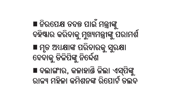 ଉଦ୍ବେଗ ପ୍ରକାଶ କଲେ। ଏଥିସହିତ ସମସ୍ତ ଅଭିଯୁକ୍ତଙ୍କୁ ତୁରନ୍ତ ଗିରଫ କରିବା ସହ ମୃତ ଅଧ୍ୟକ୍ଷାଙ୍କ ପରିବାରକୁ ସୁରକ୍ଷା ଯୋଗାଇ ଦେବାକୁ ଏନ୍ସିଡବ୍ଲ୍ୟୁ ଓଡ଼ିଶା ପୋଲିସ ମହାନିର୍ଦ୍ଦେଶକ(ଡିଜିପି) ଅଭୟଙ୍କୁ ମଧ୍ୟ ଜଣାଇଛନ୍ତି। ନିର୍ଦ୍ଧାରିତ ସମୟରେ ଏହି ଘଟଣାର ତଦନ୍ତ ଶେଷ କରି ଯଥାଶୀଘ୍ର ପଦପେକ୍ଷ ସମ୍ପର୍କରେ ଜଣାଇବାକୁ ସେ ଡିଜିଙ୍କୁ ନିର୍ଦ୍ଦେଶ ଦେଇଛନ୍ତି।