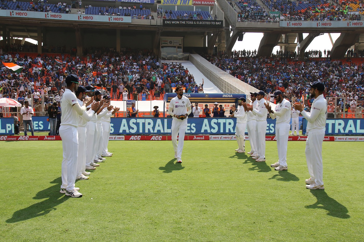 ଅହମଦାବାଦ, ୨୫।୨(ପି.ଟି.)- ଇଂଲଣ୍ଡ ବିପକ୍ଷରେ କ୍ୟାରିୟରର ୧୦୦ତମ ଟେଷ୍ଟ ଖେଳିଥିବାରୁ ଭାରତୀୟ ଦ୍ରୁତ ବୋଲର ଈଶାନ୍ତ ଶର୍ମାଙ୍କୁ ବୁଧବାର ସମ୍ବର୍ଦ୍ଧିତ କରାଯାଇଛି। ନରେନ୍ଦ୍ର ମୋଦି ଷ୍ଟାଡିୟମରେ ମ୍ୟାଚ ପୂର୍ବରୁ ରାଷ୍ଟ୍ରପତି ରାମନାଥ କୋବିନ୍ଦ ତାଙ୍କୁ ଏକ ସ୍ମରଣିକା ଏବଂ ଗୃହ ମନ୍ତ୍ରୀ ଅମିତ ଶାହା ସ୍ବତନ୍ତ୍ର ବିସିସିଆଇ ଟୋପି ପ୍ରଦାନ କରିଥିଲେ। ଏହି ଅବସରରେ କେନ୍ଦ୍ର କ୍ରୀଡ଼ାମନ୍ତ୍ରୀ କିରେନ ରିଜିଜୁ ଓ ଭାରତୀୟ କ୍ରିକେଟ କଣ୍ଟ୍ରୋଲ ବୋର୍ଡ (ବିସିସିଆଇ) ସମ୍ପାଦକ ଜୟ ଶାହା ଉପସ୍ଥିତ ଥିଲେ। ୩୨ ବର୍ଷୀୟ ଈଶାନ୍ତ ପୂର୍ବତନ ଅଧିନାୟକ କପିଳ ଦେବଙ୍କ ପରେ ଦ୍ୱିତୀୟ ଭାରତୀୟ ଦ୍ରୁତ ବୋଲର ଭାବେ ୧୦୦ ଟେଷ୍ଟ ମ୍ୟାଚ ଖେଳିଥିଲେ। ଇଂଲଣ୍ଡ ଟସ୍ ଜିତି ପ୍ରଥମେ ବ୍ୟାଟିଂ ନିଷ୍ପତ୍ତି ନେଇଥିବାରୁ ଟିମ୍ ଇଣ୍ଡିଆ ଖେଳାଳିମାନେ ପଡ଼ିଆରେ ପ୍ରବେଶ କରିବା ବେଳେ ଲାଇନ୍ରେ ଛିଡ଼ା ହୋଇ ଦୀର୍ଘଦିନ ଧରି ଭାରତୀୟ କ୍ରିକେଟକୁ ସେବା ପାଇଁ ଈଶାନ୍ତଙ୍କୁ ଗାର୍ଡ ଅଫ୍ ଅନର ଜଣାଇଥିଲେ। ନିଜ ୧୦୦ତମ ଟେଷ୍ଟକୁ ସ୍ମରଣୀୟ କରି ଈଶାନ୍ତ ପ୍ରଥମ ଇନିଂସରେ ଗୋଟିଏ ଉଇକେଟ ମଧ୍ୟ ନେଇଥିଲେ। ଚଳିତ ଇଂଲଣ୍ଡ ବିପକ୍ଷ ସିରିଜର ପ୍ରଥମ ଟେଷ୍ଟରେ ଈଶାନ୍ତ ୩୦୦ ଉଇକେଟ ପୂରଣ କରିଥିଲେ। ଭାରତର ତୃତୀୟ ପେସର ଏବଂ ୬ଷ୍ଠ ବୋଲର ଭାବେ ସେ ଏହି ସଫଳତା ପାଇଥିଲେ। ୨୦୦୭ରେ ବାଂଲାଦେଶ ବିପକ୍ଷରେ ଟେଷ୍ଟ କ୍ୟାରିୟର ଆରମ୍ଭ କରିଥିବା ଈଶାନ୍ତ ୧୧ ଥର ୫ ଉଇକେଟ ଏବଂ ଥରେ ଏକ ମ୍ୟାଚରେ ୧୦ ଉଇକେଟ ସଫଳତା ପାଇଥିଲେ। ଏଠାରେ ଦିବାରାତ୍ର ଟେଷ୍ଟ ଆରମ୍ଭ ହେବା ପୂର୍ବରୁ ବିରାଟ କୋହଲି, ସଚିନ ତେନ୍ଦୁଲକର, ବୀରେନ୍ଦ୍ର ସେହ୍ବାଗ, ଆଶିଷ ନେହେରାଙ୍କ ପରି ଅନେକ ପ୍ରତିଷ୍ଠିତ ଖେଳାଳି ଈଶାନ୍ତଙ୍କ ପ୍ରଶଂସାରେ ଶତମୁଖ ହୋଇଥିଲେ।