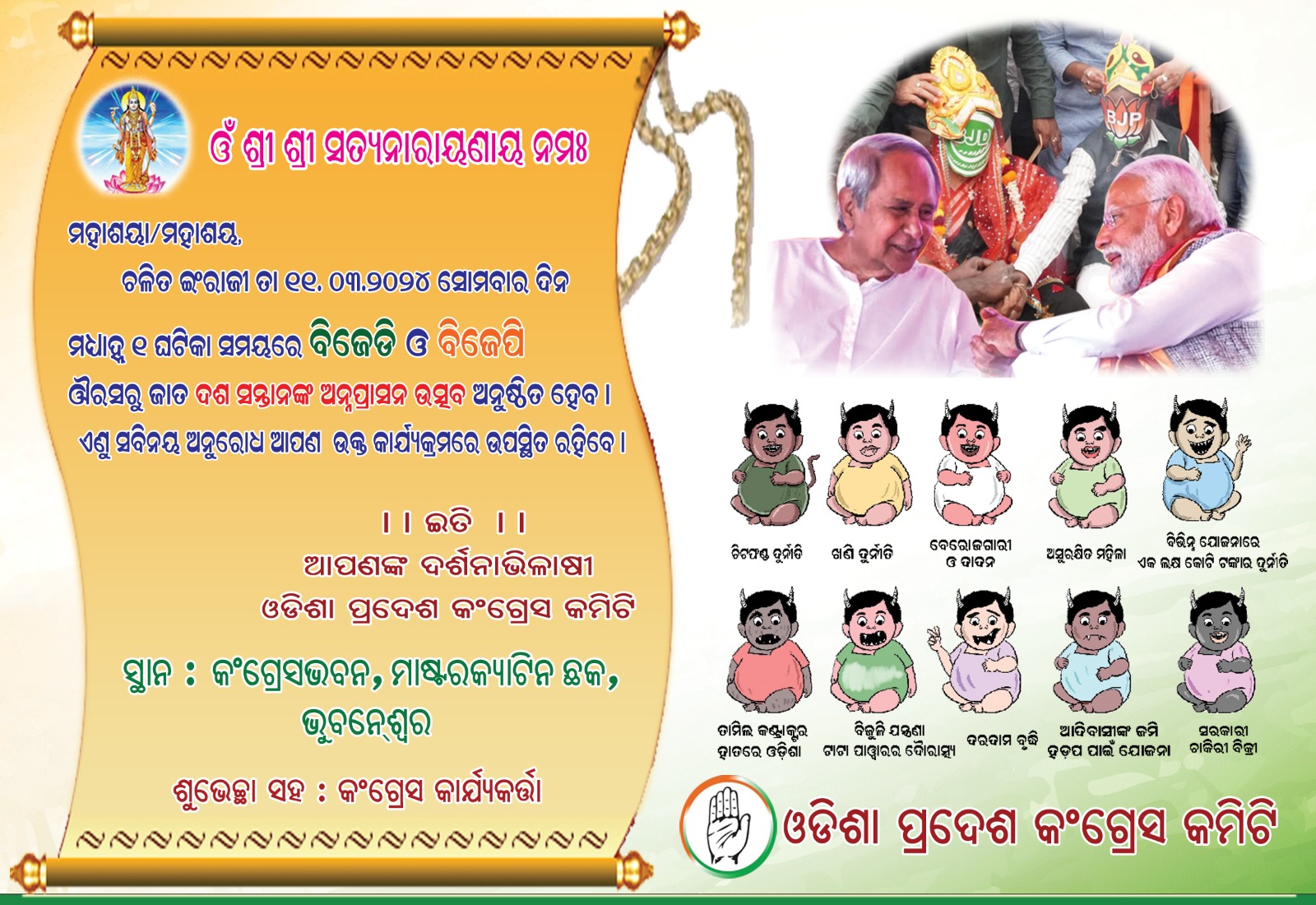 ଭୁବନେଶ୍ୱର, ୧୧।୩:(ସୁନିତ୍ ମିଶ୍ର) ଭାଜପା ଓ ବିଜେଡି ମଧ୍ୟରେ ମିଛ ବାହାଘର କରିଥିବା କଂଗ୍ରେସ ପୁଣିଥରେ ଉଭୟଙ୍କ ସମ୍ପର୍କକୁ ନେଇ ଅନ୍ନପ୍ରାଶନ ଉତ୍ସବ କରିବାକୁ ନିଷ୍ପତ୍ତି ନେଇଛି। ସୋମବାର କଂଗ୍ରେସ ଭବନ ପରିସରରେ ହିନ୍ଦୁ ରୀତିନୀତିରେ ଏହି ଅନ୍ନପ୍ରାଶନ କାର୍ଯ୍ୟକ୍ରମ ହେବ। ଏଥିରେ ବିଜେଡି ଓ ଭାଜପା ସମ୍ପର୍କରେ ଜନ୍ମ ନେଇଥିବା ପିଲାଙ୍କ ନାମକରଣ କରାଯିବ ବୋଲି ଦଳ ସୂଚନା ଦେଇଛି।