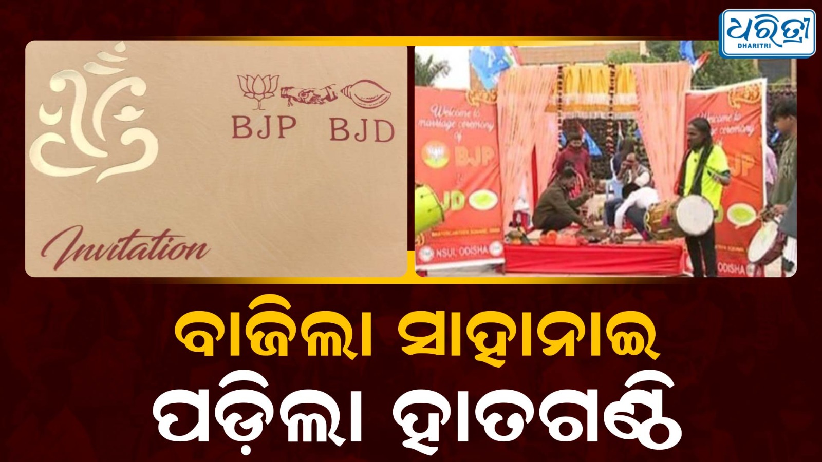 ତେଣୁ ଉଭୟଙ୍କର ବିବାହ କରି ଏକାଠି କରିବା ପାଇଁ କଂଗ୍ରେସ ବାହାଘର ଆୟୋଜନ କରିଛି। ଏଥିପାଇଁ କଂଗ୍ରେସ ପକ୍ଷରୁ ନିମନ୍ତ୍ରଣ କାର୍ଡ ବଣ୍ଟା ଯାଇ ବାହାଘରର ତାରିଖ, ଲଗ୍ନ ମଧ୍ୟ ଏହି କାର୍ଡରେ ଉଲ୍ଲେଖ କରାଯାଇଛି। ଭୁବନେଶ୍ୱର ମାଷ୍ଟର କ୍ୟାଣ୍ଟିନରେ ବେଦୀ କରାଯାଇଥିବା ବେଳେ ଗୁରୁବାର ହିଁ ବରାନୁଗମନ ହେଉଥିବା କଂଗ୍ରେସ ପକ୍ଷରୁ କୁହାଯାଇଛି। ୨୩ ବର୍ଷ ହେଲା ଲିଭ୍ ଇନ୍ରେ ରହୁଛନ୍ତି ବିଜେପି ଓ ବିଜେଡି। ତେଣୁ ଏବେ ବାହାଘରର ସମୟ ଆସିଛି। ତେଣୁ ଉଭୟଙ୍କ ବାହାଘର କରାଯାଉଛି।