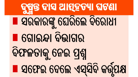 ଆର୍ଥିକ ବୋଝ ସହ ପରିବାରର ଭାର ମୁଣ୍ଡ ଉପରେ ଥିବାବେଳେ ଚିକିତ୍ସା ନ ପାଇ ଭାରସାମ୍ୟ ହରାଇ ଦୁଷ୍ମନ୍ତ ବିଧାନସଭା ନିକଟରେ ହାତ କାଟି ବିଷପାନ କରି ଆତ୍ମହତ୍ୟା ଉଦ୍ୟମ କରିବା ଏବଂ ପରେ ଚିକିତ୍ସାଧୀନ ଅବସ୍ଥାରେ ସନ୍ଧ୍ୟାରେ ତାଙ୍କର ମୃତ୍ୟୁ ଘଟିବା ଗୋଇନ୍ଦା ବିଭାଗର ବିଫଳତାକୁ ମଧ୍ୟ ଅଙ୍ଗୁଳି ନିର୍ଦ୍ଦେଶ କରୁଛି। ବିଧାନସଭା ଅଧିବେଶନ ଚାଲିଥିବାରୁ ଗୋଇନ୍ଦା ବିଭାଗ ସମ୍ପୂର୍ଣ୍ଣ ସଜାଗ ରହିଛି। ଏହାସତ୍ତ୍ୱେ ଜଣେ ଯୁବକ ବିଧାନ ସଭା ନିକଟରେ ନିଜ ହାତ କାଟି ବିଷପାନ କରିଥିଲେ ସୁଦ୍ଧା ଗୋଇନ୍ଦା ବିଭାଗ ପୂର୍ବରୁ ନ ଜାଣିପାରିବାକୁ ନେଇ ପ୍ରଶ୍ନବାଚୀ ସୃଷ୍ଟି କରିଛି। ଯଦି ଗୋଇନ୍ଦା ବିଭାଗ ପୂର୍ବ ସୂଚନା ଦେଇଥାନ୍ତା ହୁଏତ ଦୁଷ୍ମନ୍ତଙ୍କ ଜୀବନ ବଞ୍ଚତ୍ ଯାଇପାରିଥାନ୍ତା। ଗୋଇନ୍ଦା ବିଭାଗର ବିଫଳତା ବିରୋଧରେ କିଭଳି କାର୍ଯ୍ୟାନୁଷ୍ଠାନ ନିଆଯାଉଛି ତାହା ଉପରେ ଏବେ ସମସ୍ତଙ୍କ ନଜର।