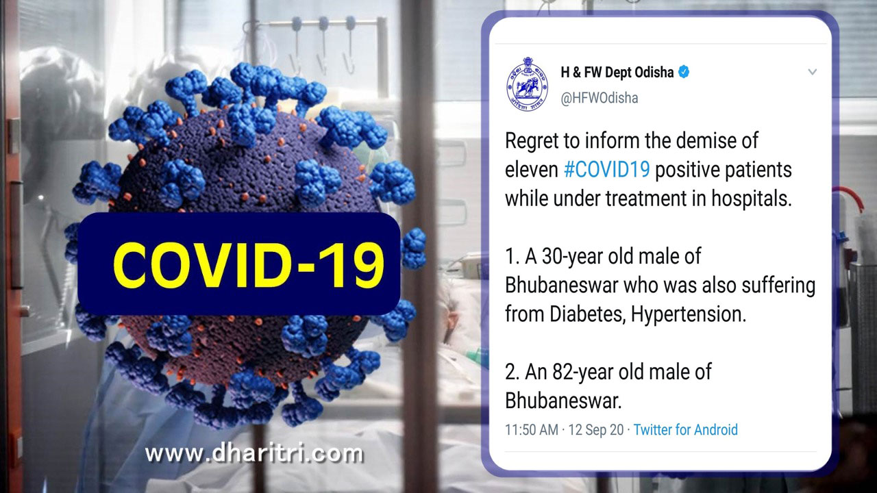 ଭୁବନେଶ୍ୱର,୧୨।୯(ବ୍ୟୁରୋ): ରାଜ୍ୟରେ ଶନିବାର ଆଉ ୧୧ ଜଣଙ୍କ ମୁଣ୍ଡ ନେଇଛି କରୋନା। ଏହାକୁ ମିଶାଇ ରାଜ୍ୟରେ କରୋନା ଜନିତ ମୃତ୍ୟୁ ସଂଖ୍ୟା ୬୧୬ ରେ ପହଞ୍ଚିଥିବା ରାଜ୍ୟ ସ୍ବାସ୍ଥ୍ୟ ଓ ପରିବାର କଲ୍ୟାଣ ବିଭାଗ ପକ୍ଷରୁ ସୂଚନା ମିଳିଛି। ତେବେ ୧୧ ମୃତକଙ୍କ ମଧ୍ୟରୁ କଟକରୁ ୩, ଖୋର୍ଦ୍ଧାରୁ ୨ ଜଣ ଅଛନ୍ତି । ସେହିଭଳି କନ୍ଧମାଳ, ରାୟଗଡ଼ା, ଯାଜପୁର, ନୟାଗଡ଼, ବଲାଙ୍ଗୀର ଓ କେନ୍ଦୁଝର ଜଣେ ଲେଖାଏ ରହିଛନ୍ତି।