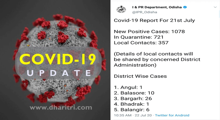 ଭୁବନେଶ୍ୱର, ୨୨।୭(ବ୍ୟୁରୋ): ରାଜ୍ୟରେ କରୋନା ସବୁ ରେକର୍ଡ ଭାଙ୍ଗିଛି। ଦିନକରେ ଅର୍ଥାତ୍ ବୁଧବାର ପୁଣି ୧୦୭୮ ଜଣ କରୋନା ପଜିଟିଭ ଚିହ୍ନଟ ହୋଇଛନ୍ତି। ଏହାକୁ ମିଶାଇ ରାଜ୍ୟରେ ମୋଟ ଆକ୍ରାନ୍ତଙ୍କ ସଂଖ୍ୟା ୧୯,୮୩୫ରେ ପହଞ୍ଚିଛି। ଏ ନେଇ ରାଜ୍ୟ ସୂଚନା ଓ ଲୋକ ସମ୍ପର୍କ ବିଭାଗ ପକ୍ଷରୁ ସୂଚନା ଦିଆଯାଇଛି। ତେବେ ନୂଆ ଚିହ୍ନଟ ୧୦୭୮ ଆକ୍ରାନ୍ତ ୨୮ ଜିଲାର। ଏମାନଙ୍କ ମଧ୍ୟରୁ ମଧ୍ୟରୁ ୭୨୧ କ୍ୱାରାଣ୍ଟାଇନ ସେଣ୍ଟରରୁ ଚିହ୍ନଟ ହୋଇଥିବା ବେଳେ ୩୭୫ ଲୋକାଲ କେସ୍ ରହିଛି।