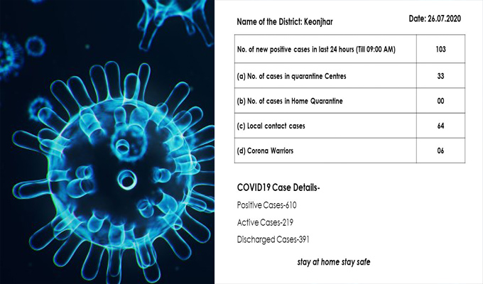 କେନ୍ଦୁଝର,୨୬ା୭(ସ୍ବ.ପ୍ର.): କେନ୍ଦୁଝର ଜିଲାରେ ରବିବାର ୧୦୩ କରୋନା ପଜିଟିଭ୍ ଚିହ୍ନଟ ହୋଇଛନ୍ତି। ଯାହାକି ସବୁଦିନର ରେକର୍ଡ ଭାଙ୍ଗିଛି। ଏହାକୁ ମିଶାଇ ଜିଲାରେ ମୋଟ୍ ଆକ୍ରାନ୍ତଙ୍କ ସଂଖ୍ୟା ୬୧୦ରେ ପହଞ୍ଚିଛି। ଶନିବାର ଦୁଇଜଣ ସୁସ୍ଥ ହୋଇଥିବା ବେଳେ ମୋଟ୍ ସୁସ୍ଥସଂଖ୍ୟା ୩୯୧ ଥିବା ବେଳେ ୨୧୯ ଜଣ ବିଭିନ୍ନ କୋଭିଡ୍ ହସ୍ପିଟାଲରେ ଚିକିତ୍ସାଧୀନ ରହିଛନ୍ତି।