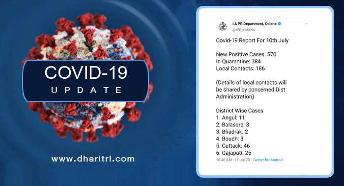 ନୂଆ ୫୭୦ ସଂକ୍ରମିତଙ୍କ ମଧ୍ୟରୁ ଗଞ୍ଜାମ ଜିଲାରୁ ସର୍ବାଧିକ ୨୧୮ ଆକ୍ରାନ୍ତ ଚିହ୍ନଟ ହୋଇଛନ୍ତି। ସେହିପରି ଅନୁଗୋଳ ୧୧, ବାଲେଶ୍ୱର ୩, ଭଦ୍ରକ ୨, ବୌଦ୍ଧ ୩, କଟକ ୪୬, ଗଜପତି ୨୫, ଜଗତ୍ସିଂହପୁର ୧୬, ଯାଜପୁର ୪୦, ଝାରସୁଗୁଡ଼ା ୩୧, କେନ୍ଦ୍ରାପଡ଼ା ୬, କେନ୍ଦୁଝର ୧୪, ଖୋର୍ଦ୍ଧା ୩୭, କୋରାପୁଟ ୧୧, ମୟୂରଭଞ୍ଜ ୧୦, ନୟାଗଡ଼ ୩୭, ପୁରୀ ୧୫, ସମ୍ବଲପୁର ୧, ସୁନ୍ଦରଗଡ଼ ୪୪।