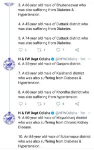ଆଜି ଖୋର୍ଦ୍ଧରୁ ୩ କରୋନା ଆକ୍ରାନ୍ତଙ୍କ ମୃତ୍ୟୁ ଘଟିଥିବା ବେଳେ କଟକରୁ ୨ ଜଣ, ବାଲେଶ୍ୱର, ଗଞ୍ଜାମ, କଳାହାଣ୍ଡି, ମୟୂରଭଞ୍ଜ ଏବଂ ସୁବର୍ଣ୍ଣପୁରରୁ ଜଣେ ଲେଖାଏ ଆକ୍ରାନ୍ତଙ୍କ ମୃତ୍ୟୁ ଘଟିଛି।
