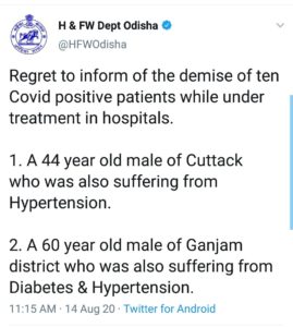 ଭୁବନେଶ୍ୱର,୧୪ା୮(ବ୍ୟୁରୋ): ଶୁକ୍ରବାର ରାଜ୍ୟରୁ ଆଉ ୧୦ ଜଣଙ୍କ ଜୀବନ ନେଇଛି କରୋନା। ଏହାକୁ ମିଶାଇ ରାଜ୍ୟରେ କରୋନା ଜନିତ ମୃତ୍ୟୁସଂଖ୍ୟା ୩୨୪ରେ ପହଞ୍ଚିଥିବା ରାଜ୍ୟ ସ୍ବାସ୍ଥ୍ୟ ଓ ପରିବାର କଲ୍ୟାଣ ବିଭାଗ ପକ୍ଷରୁ ସୂଚନା ଦିଆଯାଇଛି।