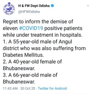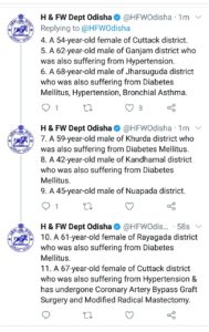 ଆଜି ଖୋର୍ଦ୍ଧାରୁ ୩ ଆକ୍ରାନ୍ତଙ୍କ ମୃତ୍ୟୁ ଘଟିଥିବାବେଳେ କଟକରୁ ୨ ଜଣଙ୍କ ମୃତ୍ୟୁ ଘଟିଛି। ସେହିପରି ଅନୁଗୋଳ, ଗଞ୍ଜାମ, ଝାରସୁଗୁଡ଼ା, କନ୍ଧମାଳ, ନୂଆପଡ଼ା, ରାୟଗଡ଼ାରୁ ଜଣେ ଲେଖାଏ ଆକ୍ରାନ୍ତଙ୍କ ମୃତ୍ୟୁ ଘଟିଛି।