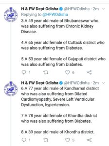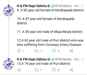 ଆଜି ଖୋର୍ଦ୍ଧା ଜିଲାରୁ ସର୍ବାଧିକ ୩ କରୋନା ଆକ୍ରାନ୍ତଙ୍କ ମୃତ୍ୟୁ ଘଟିଥିବା ବେଳେ କେନ୍ଦ୍ରାପଡ଼ା ଏବଂ ପୁରୀରୁ ୨ ଜଣ ଲେଖାଏ ଆକ୍ରାନ୍ତଙ୍କ ମୃତ୍ୟୁ ଘଟିଛି। ସେହିପରି ବରଗଡ଼, ବଲାଙ୍ଗୀର, କଟକ, କନ୍ଧମାଳ, ମୟୂରଭଞ୍ଜ ଏବଂ ଗଜପତିରୁ ଜଣେ ଲେଖାଏ ଆକ୍ରାନ୍ତଙ୍କ ମୃତ୍ୟୁ ଘଟିଛି।