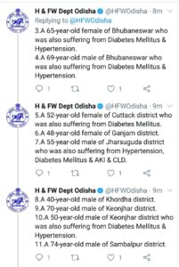 ଆଜି ସୁନ୍ଦରଗଡ଼ରୁ ସର୍ବାଧିକ ୪ ଜଣଙ୍କ ମୃତ୍ୟୁ ଘଟିଥିବା ବେଳେ ଖୋର୍ଦ୍ଧାରୁ ୩ ଏବଂ କେନ୍ଦୁଝରରୁ ୨ ଜଣଙ୍କ ମୃତ୍ୟୁ ଘଟିଛି। ସେହିପରି ଅନୁଗୋଳ, ବଲାଙ୍ଗୀର, କଟକ, ଗଞ୍ଜାମ, ଝାରସୁଗୁଡ଼ା ଏବଂ ସମ୍ବଲପୁରରୁ ଜଣେ ଲେଖାଏ ଆକ୍ରାନ୍ତଙ୍କ ମୃତ୍ୟୁ ଘଟିଛି।