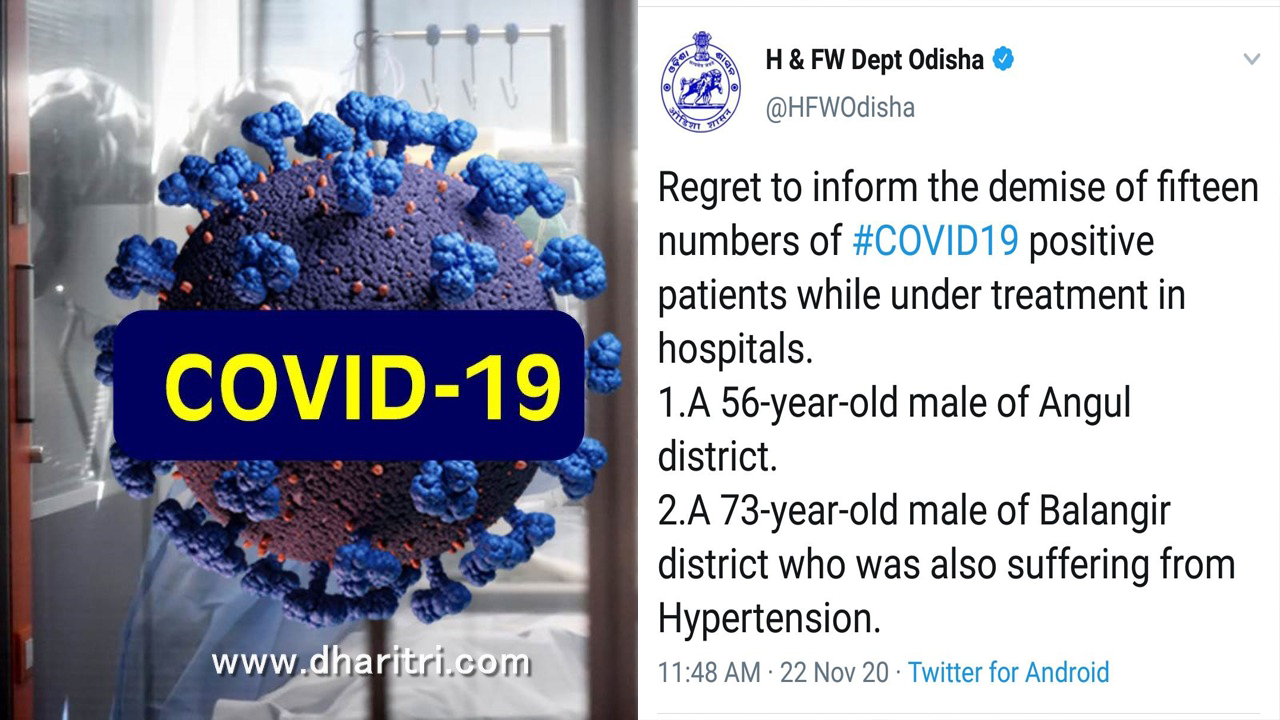 ଭୁବନେଶ୍ୱର,୨୨ା୧୧(ବ୍ୟୁରୋ): ରବିବାର ରାଜ୍ୟରୁ ଆଉ ୧୫ ଜୀବନ ନେଇଛି କରୋନା। ଏହାକୁ ମିଶାଇ ରାଜ୍ୟରେ କରୋନା ଜନିତ ମୃତ୍ୟୁସଂଖ୍ୟା ୧୬୪୦କୁ ବୃଦ୍ଧି ପାଇଥିବା ରାଜ୍ୟ ସ୍ବାସ୍ଥ୍ୟ ଓ ପରିବାର କଲ୍ୟାଣ ବିଭାଗ ପକ୍ଷରୁ ସୂଚନା ଦିଆଯାଇଛି।