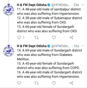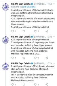 ଆଜି ସର୍ବାଧିକ ସୁନ୍ଦରଗଡ଼ ଜିଲାରୁ ୪ ଜଣଙ୍କ ମୃତ୍ୟୁ ଘଟିଥିବା ବେଳେ କଟକରୁ ୩ ଆକ୍ରାନ୍ତଙ୍କ ମୃତ୍ୟୁ ଘଟିଛି। ସେହିପରି ଗଞ୍ଜାମ ଏବଂ ସମ୍ବଲପୁରରୁ ୨ ଜଣ ଲେଖାଏ ଆକ୍ରାନ୍ତଙ୍କ ମୃତ୍ୟୁ ଘଟିଛି। ସେହିପରି ବରଗଡ଼, ଜଗତସିଂହପୁର, ଝାରସୁଗୁଡ଼ା, ପୁରୀ ଏବଂ ସୁବର୍ଣ୍ଣପୁରରୁ ଜଣେ ଲେଖାଏ ଆକ୍ରାନ୍ତଙ୍କ ମୃତ୍ୟୁ ଘଟିଛି।