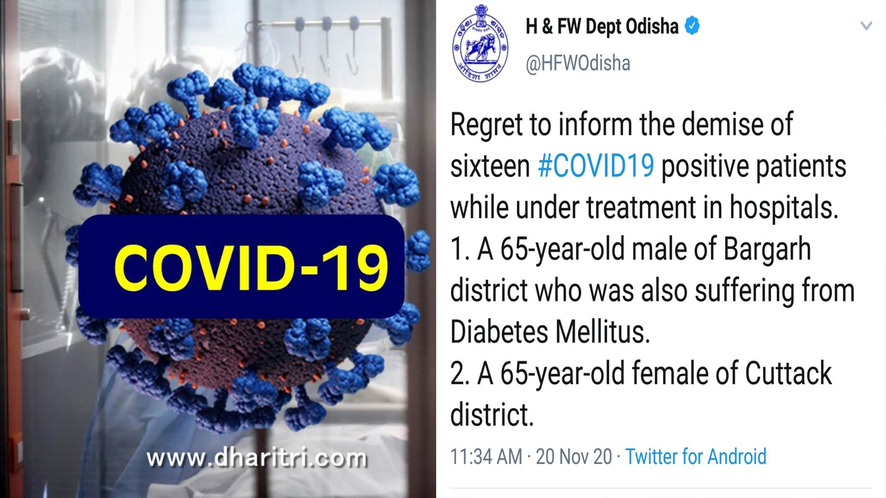 ଭୁବନେଶ୍ୱର,୨୦ା୧୧(ବ୍ୟୁରୋ): ଶୁକ୍ରବାର ରାଜ୍ୟରୁ ଆଉ ୧୬ ଜୀବନ ନେଇଛି କରୋନା। ଏହାକୁ ମିଶାଇ ରାଜ୍ୟରେ କରୋନା ଜନିତ ମୃତ୍ୟୁସଂଖ୍ୟା ୧୬୦୮କୁ ବୃଦ୍ଧି ପାଇଥିବା ରାଜ୍ୟ ସ୍ବାସ୍ଥ୍ୟ ଓ ପରିବାର କଲ୍ୟାଣ ବିଭାଗ ପକ୍ଷରୁ ସୂଚନା ଦିଆଯାଇଛି।
