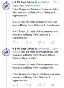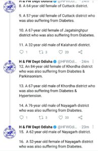ଆଜି ଖୋର୍ଦ୍ଧା ଜିଲାରୁ ସର୍ବାଧିକ ୬ ଜଣଙ୍କ ମୃତ୍ୟୁ ଘଟିଥିବା ବେଳେ ନୟାଗଡ଼ରୁ ୩ ଜଣଙ୍କ ମୃତ୍ୟୁ ଘଟିଛି। କଟକ ଏବଂ ବାଲେଶ୍ୱରରୁ ୨ ଜଣ ଲେଖାଏ ଆକ୍ରାନ୍ତଙ୍କ ମୃତ୍ୟୁ ଘଟିଛି। ସେହିପରି ଜଗତସିଂହପୁର, ବରଗଡ଼ ଏବଂ କଳାହାଣ୍ଡିରୁ ଜଣେ ଲେଖାଏ ଆକ୍ରାନ୍ତଙ୍କ ମୃତ୍ୟୁ ଘଟିଛି।