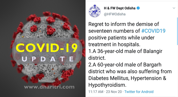 13.A 56-year-old male of Sambalpur district who was also suffering from Diabetes Mellitus.— H & FW Dept Odisha (@HFWOdisha) November 23, 2020