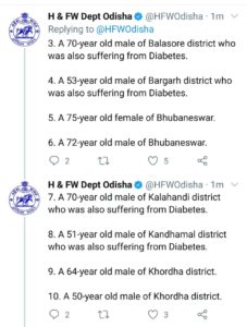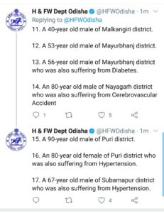 ଆଜି ସର୍ବାଧିକ ଖୋର୍ଦ୍ଧା ଜିଲାରୁ ୪ କରୋନା ଆକ୍ରାନ୍ତଙ୍କ ମୃତ୍ୟୁ ଘଟିଥିବା ବେଳେ ବାଲେଶ୍ୱରରୁ ୩, ପୁରୀ ଏବଂ ମୟୂରଭଞ୍ଜରୁ ୨ ଜଣ ଲେଖାଏ ଆକ୍ରାନ୍ତଙ୍କ ମୃତ୍ୟୁ ଘଟିଛି। ସେହିପରି ବରଗଡ଼, କଳାହାଣ୍ଡି, କନ୍ଧମାଳ,ମାଲକାନଗିରି ନୟାଗଡ଼ ଏବଂ ସମ୍ବଲପୁରରୁ ଜଣେ ଲେଖାଏ ଆକ୍ରାନ୍ତଙ୍କ ମୃତ୍ୟୁ ଘଟିଛି।