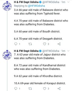 ଆଜି ବାଲେଶ୍ୱରୁ ସର୍ବାଧିକ ୪ ଜଣଙ୍କ ମୃତ୍ୟୁ ଘଟିଥିବା ବେଳେ ନୟାଗଡ଼, ସୁନ୍ଦରଗଡ଼ ଏବଂ ପୁରୀରୁ ୨ ଜଣ ଲେଖାଏ ଆକ୍ରାନ୍ତଙ୍କ ମୃତ୍ୟୁ ଘଟିଛି। ସେହିପରି ବୌଦ୍ଧ, ଦେବଗଡ଼, ଯାଜପୁର, କନ୍ଧମାଳ, ଖୋର୍ଦ୍ଧା, କୋରାପୁଟ,ମୟୂରଭଞ୍ଜ ଏବଂ ସମ୍ବଲପୁରରୁ ଜଣେ ଲେଖାଏ ଆକ୍ରାନ୍ତଙ୍କ ମୃତ୍ୟୁ ଘଟିଛି।