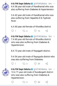 ମୃତକମାନଙ୍କ ମଧ୍ୟରେ ଖୋର୍ଦ୍ଧା ଓ କନ୍ଧମାଳ ଜିଲାରୁ ୩ ଜଣ ଲେଖାଏ ଥିବା ବେଳେ ଗଞ୍ଜାମ, ରାୟଗଡ଼ା, ନୟାଗଡ଼ ଏବଂ ସୁନ୍ଦରଗଡ଼ରୁ ଜଣେ ଲେଖାଏ ଅଛନ୍ତି।
