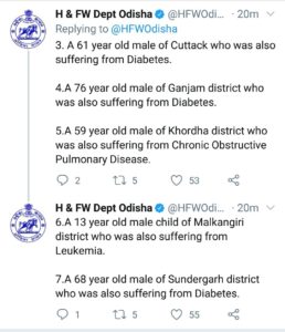 ଖୋର୍ଦ୍ଧା ଜିଲାରୁ ୨ କରୋନା ଆକ୍ରାନ୍ତଙ୍କ ମୃତ୍ୟୁ ଘଟିଥିବା ବେଳେ ବଲାଙ୍ଗୀର, କଟକ, ଗଞ୍ଜାମ, ମାଲକାନଗିରି ଏବଂ ସୁନ୍ଦରଗଡ଼ରୁ ଜଣେ ଲେଖାଏ ଆକ୍ରାନ୍ତଙ୍କ ମୃତ୍ୟୁ ଘଟିଛି।