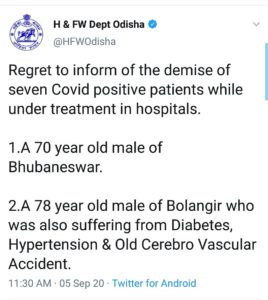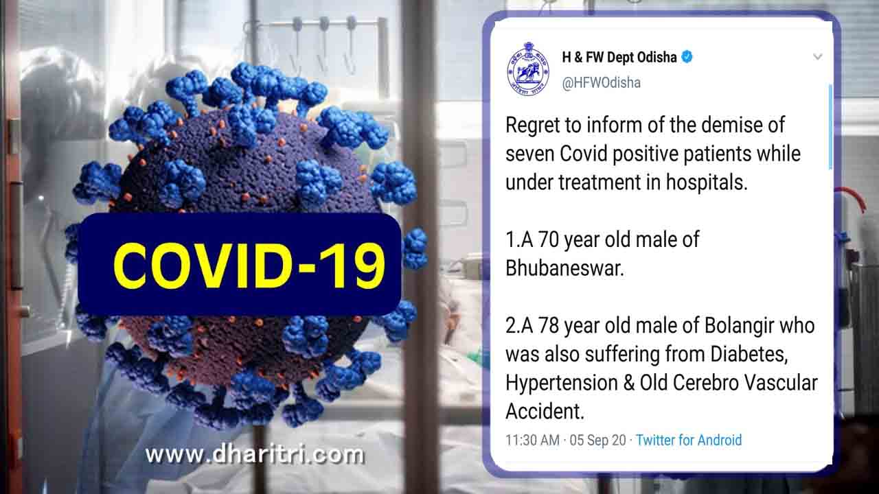 ଭୁବନେଶ୍ୱର,୫।୯(ବ୍ୟୁରୋ): ଶନିବାର ରାଜ୍ୟରୁ ଆଉ ୭ ଜୀବନ ନେଇଛି କରୋନା। ଏହାକୁ ମିଶାଇ ରାଜ୍ୟରେ କରୋନା ଜନିତ ମୃତ୍ୟୁସଂଖ୍ୟା ୫୩୮କୁ ବୃଦ୍ଧି ପାଇଥିବା ରାଜ୍ୟ ସ୍ବାସ୍ଥ୍ୟ ଓ ପରିବାର କଲ୍ୟାଣ ବିଭାଗ ପକ୍ଷରୁ ସୂଚନା ଦିଆଯାଇଛି।