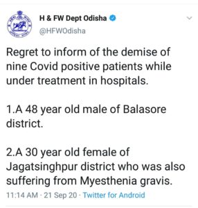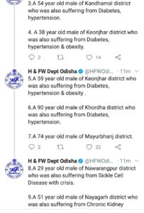 ଆଜି କେନ୍ଦୁଝର ଜିଲାରୁ ୨ ଜଣ କରୋନା ଆକ୍ରାନ୍ତଙ୍କ ମୃତ୍ୟୁ ଘଟିଥିବା ବେଳେ ବାଲେଶ୍ୱର, ଜଗତସିଂହପୁର, କନ୍ଧମାଳ, ଖୋର୍ଦ୍ଧା, ମୟୂରଭଞ୍ଜ, ନବରଙ୍ଗପୁର ଏବଂ ନୟାଗଡ଼ରୁ ଜଣେ ଲେଖାଏ ଆକ୍ରାନ୍ତଙ୍କ ମୃତ୍ୟୁ ଘଟିଛି।