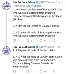 ମୃତକଙ୍କ ମଧ୍ୟରେ ଗଞ୍ଜାମରୁ ୪, ଗଜପତି, ସୁନ୍ଦରଗଡ଼, ନୟାଗଡ଼ ଏବଂ ଖୋର୍ଦ୍ଧାରୁ ଜଣେ ଲେଖାଏ ଅଛନ୍ତି। ଗଞ୍ଜାମରୁ ଜଣେ ୮୧ ବର୍ଷୀୟ ବୃଦ୍ଧ, ୭୩ ବର୍ଷୀୟ ବୃଦ୍ଧ, ୪୯ ଏବଂ ୪୫ ବର୍ଷୀୟ ବ୍ୟକ୍ତିଙ୍କ ମୃତ୍ୟୁ ଘଟିଛି। ୮୧ ବର୍ଷୀୟ ବୃଦ୍ଧ ଜଣଙ୍କ ଡାଇବେଟିସ୍‌ ରୋଗରେ ପୀଡ଼ିତ ଥିବା ବେଳେ ୭୩ ବର୍ଷୀୟ ବୃଦ୍ଧ ଜଣଙ୍କ ମଧ୍ୟ ଡାଇବେଟିସ୍‌ ଏବଂ ଉଚ୍ଚ ରକ୍ତଚାପ ରୋଗରେ ପୀଡ଼ିତ ଥିଲେ। ସେହିପରି ଗଜପତିରୁ ଜଣେ ୫୮ ବର୍ଷୀୟା ମହିଳାଙ୍କ ମୃତ୍ୟୁ ଘଟିଛି। ସୁନ୍ଦରଗଡ଼ର କରୋନା ଆକ୍ରାନ୍ତ ଜଣଙ୍କ ଡାଇବେଟିସ୍‌ ରୋଗରେ ପୀଡ଼ିତ ଥିଲେ। ନୟାଗଡ଼ର ୮୨ ବର୍ଷୀୟା ବୃଦ୍ଧା ଜଣଙ୍କ ଡାଇବେଟିସ୍‌, ଉଚ୍ଚ ରକ୍ତଚାପ ସହ ଅନ୍ୟ ରୋଗରେ ମଧ୍ୟ ପୀଡ଼ିତ ଥିଲେ। ଖୋର୍ଦ୍ଧା ଜିଲାରୁ ଜଣେ ୭୯ବର୍ଷୀୟ ବୃଦ୍ଧଙ୍କ ମୃତ୍ୟୁ ଘଟିଛି। ସେ ଉଚ୍ଚ ରକ୍ତଚାପ ଏବଂ ଡାଇବେଟିସ୍‌ ସହ ଅନ୍ୟ ରୋଗରେ ମଧ୍ୟ ପୀଡ଼ିତ ଥିଲେ।
