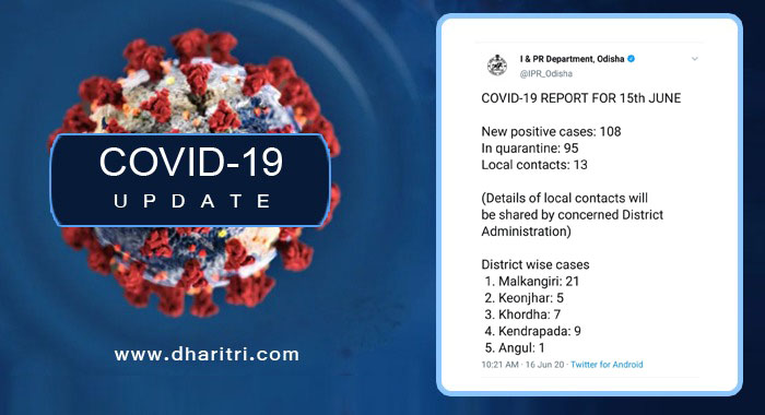 ନୂଆ ୧୦୮ ସଂକ୍ରମିତଙ୍କ ମଧ୍ୟରୁ ମାଲକାନଗିରିରୁ ସର୍ବାଧିକ ୨୧ ଜଣ ଚିହ୍ନଟ ହୋଇଛନ୍ତି। ସେହିପରି ପୁରୀରୁ ୧୫, ଜଗତ୍ସିଂହପୁର ଓ କେନ୍ଦ୍ରାପଡ଼ାରୁ ୯ ଜଣ ଲେଖାଏ, ଗଞ୍ଜାମ ୮, ଗଜପତି ଓ ଖୋର୍ଦ୍ଧାରୁ ୭ ଜଣ ଲେଖାଏ କେନ୍ଦୁଝର ୫, ବାଲେଶ୍ୱର ୪, ସୁନ୍ଦରଗଡ଼ ୨, କଟକ, କଳାହାଣ୍ଡି, ବରଗଡ଼, ବଲାଙ୍ଗୀର ଓ ଅନୁଗୋଳରୁ ଜଣେ ଲେଖାଏ ଚିହ୍ନଟ ହୋଇଛନ୍ତି। ବାତ୍ୟା ‘ଅମ୍ଫନ’ ଉଦ୍ଧାର କାର୍ଯ୍ୟ ସାରି କୋଲକାତାରୁ ଫେରିଥିବା ଆଉ ୧୬ ଅଗ୍ନିଶମ କର୍ମଚାରୀ ମଧ୍ୟ କରୋନା ଆକ୍ରାନ୍ତ ହୋଇଥିବା ସୂଚନା ମିଳିଛି।