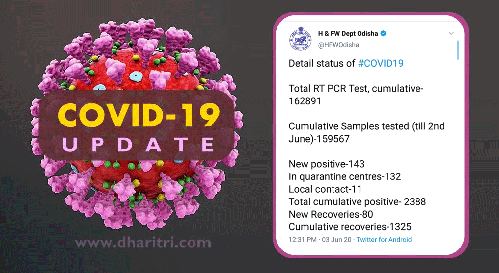 ଭୁବନେଶ୍ୱର, ୩।୬(ବ୍ୟୁରୋ): ରାଜ୍ୟରେ ଆଉ ୧୪୩ ନୂଆ କରୋନା ଆକ୍ରାନ୍ତ ଚିହ୍ନଟ ହୋଇଛନ୍ତି। ସେମାନଙ୍କ ମଧ୍ୟରୁ ୧୩୨ କ୍ୱାରାଣ୍ଟାଇନ୍ ସେଣ୍ଟରର ହୋଇଥିବା ବେଳେ ୧୧ ଲୋକାଲ କେସ୍ ରହିଛି। ଏହାକୁ ମିଶାଇ ମୋଟ୍ ଆକ୍ରାନ୍ତଙ୍କ ସଂଖ୍ୟା ୨୩୮୮କୁ ବୃଦ୍ଧି ପାଇଛି। ଏ ନେଇ ବୁଧବାର ସ୍ବାସ୍ଥ୍ୟ ଓ ପରିବାର କଲ୍ୟାଣ ବିଭାଗ ପକ୍ଷରୁ ସୂଚନା ଦିଆଯାଇଛି।