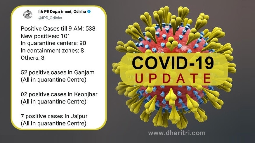 ଭୁବନେଶ୍ୱର, ୧୩।୫(ବ୍ୟୁରୋ): ବୁଧବାର ସକାଳେ ରାଜ୍ୟରେ ଚିହ୍ନଟ ହୋଇଥିବା ୧୦୧ ଆକ୍ରାନ୍ତଙ୍କ ତଥ୍ୟ ଦେଇଛନ୍ତି ରାଜ୍ୟ ସରକାର। ଆଜି ଚିହ୍ନଟ ଆକ୍ରାନ୍ତଙ୍କ ମଧ୍ୟରୁ ୯୦ଜଣ କ୍ୱାରାଣ୍ଟାଇନ ସେଣ୍ଟରରେ ଥିଲେ। ୮ଜଣ କଣ୍ଟେମେଣ୍ଟ ଜୋନ୍ର ହୋଇଥିବା ବେଳେ ଅନ୍ୟ ୩ ଜଣ ଲୋକାଲ ଲୋକ। ଏ ନେଇ ସ୍ବାସ୍ଥ୍ୟ ଓ ପରିବାର କଲ୍ୟାଣ ବିଭାଗ ପକ୍ଷରୁ ସୂଚନା ମିଳିଛି।