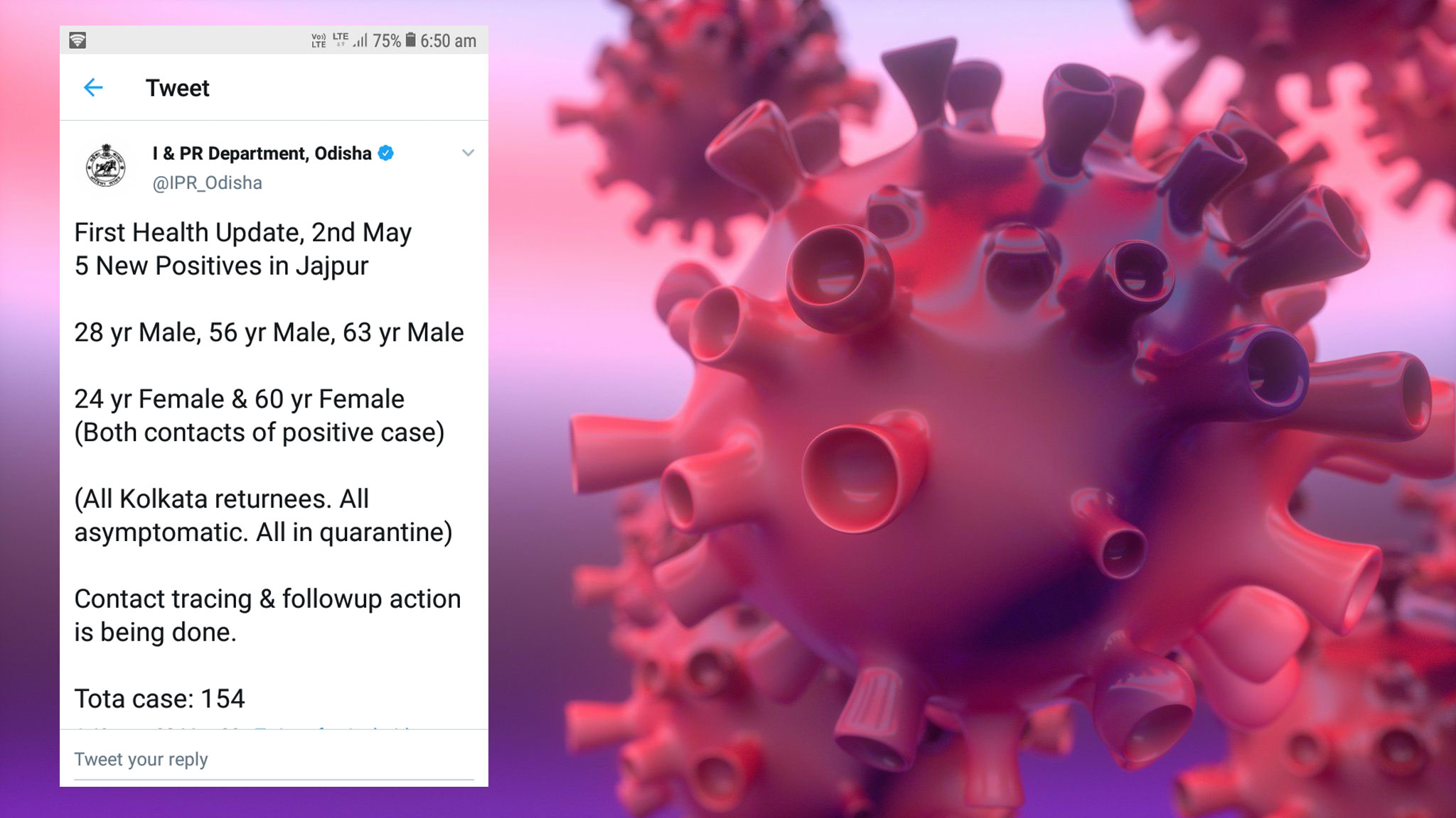 ରାଜ୍ୟରେ ଏଯାବତ୍ ୧୫୪ କରୋନା ପଜିଟିଭ ଚିହ୍ନଟ ହୋଇଛନ୍ତି। ସେଥିମଧ୍ୟରୁ ଆକ୍ଟିଭ କେସ୍ ୯୮ ଥିବା ବେଳେ ୫୫ଜଣ ସୁସ୍ଥ ହୋଇ ଘରକୁ ଫେରଇଚନ୍ତି। ଜଣଙ୍କର ମୃତ୍ୟୁ ଘଟିଥିବା ରାଜ୍ୟ ସ୍ବାସ୍ଥ୍ୟ ଓ ପରିବାର କଲ୍ୟାଣ ବିଭାଗ ଓ୍ବେବ୍ସାଇଟ୍ରୁ ସୂଚନା ମିଳିଛି।
