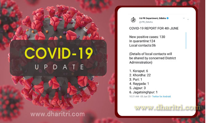 ଭୁବନେଶ୍ୱର, ୫।୬(ବ୍ୟୁରୋ): ରାଜ୍ୟରେ ଶୁକ୍ରବାର ପୁଣି ୧୩୦ ଜଣ କରୋନା ପଜିଟିଭ ଚିହ୍ନଟ ହୋଇଛନ୍ତି। ଏହାକୁ ମିଶାଇ ମୋଟ ଆକ୍ରାନ୍ତଙ୍କ ସଂଖ୍ୟା ୨୬୦୮ରେ ପହଞ୍ଚିଛି। ତେବେ ନୂଆ ୧୩୦ ଆକ୍ରାନ୍ତଙ୍କ ମଧ୍ୟରୁ ୧୨୪ କ୍ୱାରାଣ୍ଟାଇନ କେନ୍ଦ୍ରରୁ ଚିହ୍ନଟ ହୋଇଥିବା ବେଳେ ୬ଟି ଲୋକାଲ କେସ୍ ରହିଛି। ଏ ନେଇ ରାଜ୍ୟ ସ୍ବାସ୍ଥ୍ୟ ଓ ପରିବାର କଲ୍ୟାଣ ବିଭାଗ ପକ୍ଷରୁ ସୂଚନା ଦିଆଯାଇଛି।