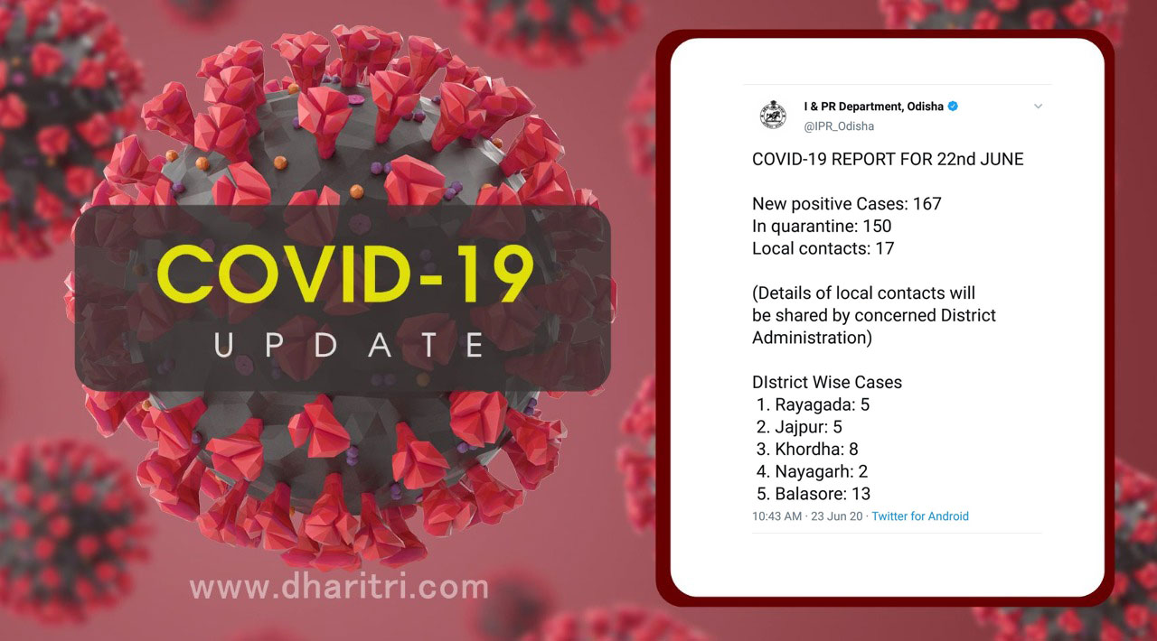 ଭୁବନେଶ୍ୱର, ୨୦।୬(ବ୍ୟୁରୋ): ରାଜ୍ୟରେ ମଙ୍ଗଳବାର ପୁଣି ୧୬୭ ଜଣ କରୋନା ପଜିଟିଭ ଚିହ୍ନଟ ହୋଇଛନ୍ତି। ଏହାକୁ ମିଶାଇ ରାଜ୍ୟରେ ମୋଟ ଆକ୍ରାନ୍ତଙ୍କ ସଂଖ୍ୟା ୫,୪୭୦ରେ ପହଞ୍ଚିଛି। ଏନେଇ ରାଜ୍ୟ ସୂଚନା ଓ ଲୋକ ସମ୍ପର୍କ ବିଭାଗ ପକ୍ଷରୁ ସୂଚନା ଦିଆଯାଇଛି। ତେବେ ନୂଆ ୧୬୭ଆକ୍ରାନ୍ତଙ୍କ ମଧ୍ୟରୁ ୧୫୦ କ୍ୱାରାଣ୍ଟାଇଈନ ସେଣ୍ଟରରୁ ଚିହ୍ନଟ ହୋଇଥିବା ବେଳେ ୧୭ ଲୋକାଲ କେସ୍ ରହିଛି।
