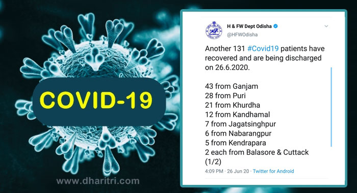 ଭୁବନେଶ୍ୱର, ୨୬।୬(ବ୍ୟୁରୋ): ରାଜ୍ୟରେ ଶୁକ୍ରବାର ୧୩୧ କରୋନା ପଜିଟିଭ ସୁସ୍ଥ ହୋଇଛନ୍ତି। ଏଥିରେ ଗଞ୍ଜାମ ଜିଲାରୁ ସର୍ବାଧିକ ୪୩ଜଣ ଅଛନ୍ତି। ସେହିଭଳି ପୁରୀ ୨୮, ଖୋର୍ଦ୍ଧା ୨୧, କନ୍ଧମାଳ ୧୨, ଜଗତ୍ସିଂହପୁର ୭, ନବରଙ୍ଗପୁର ୬, କେନ୍ଦ୍ରାପଡ଼ା ୫, ବାଲେଶ୍ୱର ଓ କଟକରୁ ୨ ଜଣ ଲେଖାଏ, ବରଗଡ଼, ବଲାଙ୍ଗୀର, ଝାରସୁଗୁଡ଼ା, କେନ୍ଦୁଝର ଓ ସୁନ୍ଦରଗଡ଼ରୁ ଜଣେ ଲେଖାଏ ସୁସ୍ଥ ହୋଇଛନ୍ତି। ଏହାକୁ ମିଶାଇ ରାଜ୍ୟରେ ମୋଟ ଆରୋଗ୍ୟ ସଂଖ୍ୟା ୪୪୨୨କୁ ବୃଦ୍ଧି ପାଇଛି। ଏ ନେଇ ରାଜ୍ୟ ସ୍ବାସ୍ଥ୍ୟ ଓ ପରିବାର କଲ୍ୟାଣ ବିଭାଗ ପକ୍ଷରୁ ଟୁଇଟ୍କରି ସୂଚନା ଦିଆଯାଇଛି।