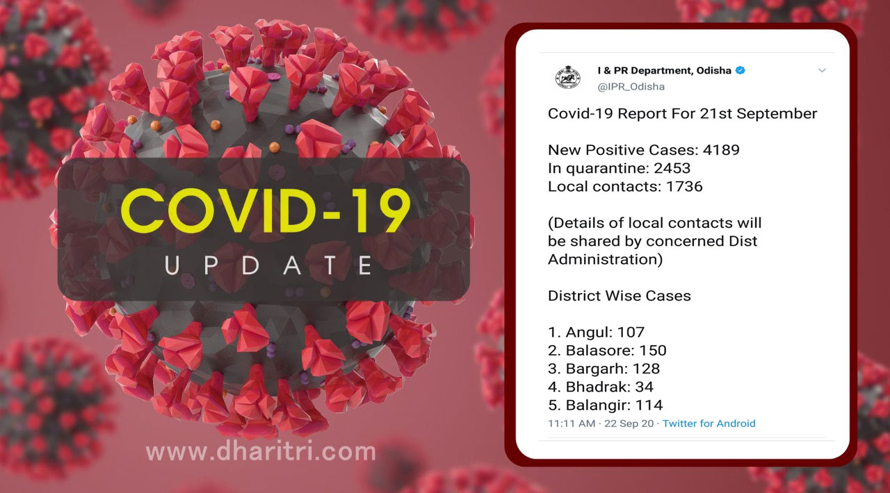 ଭୁବନେଶ୍ୱର,୨୨।୯(ବ୍ୟୁରୋ): ରାଜ୍ୟରେ ମଙ୍ଗଳବାର ୪୧୮୯ ନୂଆ କରୋନା ପଜିଟିଭ୍ ଚିହ୍ନଟ ହୋଇଛନ୍ତି। ଏହାକୁ ମିଶାଇ ରାଜ୍ୟରେ ମୋଟ୍ ଆକ୍ରାନ୍ତଙ୍କ ସଂଖ୍ୟା ୧୮୮୩୧୧କୁ ବୃଦ୍ଧି ପାଇଥିବା ରାଜ୍ୟ ସ୍ବାସ୍ଥ୍ୟ ଓ ପରିବାର କଲ୍ୟାଣ ବିଭାଗ ପକ୍ଷରୁ ସୂଚନା ମିଳିଛି। ଆକ୍ରାନ୍ତଙ୍କ ମଧ୍ୟରୁ ୨୪୫୩ ଜଣ କ୍ୱାରାଣ୍ଟାଇନ୍ ସେଣ୍ଟରରୁ ଚିହ୍ନଟ ହୋଇଥିବା ବେଳେ ୧୭୩୬ ଜଣ ସ୍ଥାନୀୟ ଅଞ୍ଚଳର ବୋଲି ଜଣାପଡ଼ିଛି। ସେଥିମଧ୍ୟରୁ ଖୋର୍ଦ୍ଧା ଜିଲାରୁ ସର୍ବାଧିକ ୭୧୨ ଆକ୍ରାନ୍ତ ଚିହ୍ନଟ ହୋଇଥିବା ବେଳେ ଅନୁଗୋଳରୁ ୧୦୭, ବାଲେଶ୍ୱରରୁ ୧୫୦, ବରଗଡ଼ରୁ ୧୨୮, ଭଦ୍ରକରୁ ୩୪, ବଲାଙ୍ଗୀରରୁ ୧୧୪, ବୌଦ୍ଧରୁ ୭୭, କଟକରୁ ୫୮୬, ଦେବଗଡ଼ରୁ ୧୨, ଢେଙ୍କାନାଳରୁ ୫୪, ଗଜପତିରୁ ୨ ଆକ୍ରାନ୍ତ ଚିହ୍ନଟ ହୋଇଛନ୍ତି। ସେହିଭଳି ଗଞ୍ଜାମରୁ ୩୫ ଜଗତ୍ସିଂହପୁରରୁ ୧୦୪, ଯାଜପୁରରୁ ୧୮୭, ଝାରସୁଗୁଡ଼ାରୁ ୮୪, କଳାହାଣ୍ଡିରୁ ୧୦୫, କନ୍ଧମାଳରୁ ୭୪, କେନ୍ଦ୍ରାପଡ଼ାରୁ ୧୨୬, କେନ୍ଦୁଝରରୁ ୩୩, କୋରାପୁଟରୁ ୬୩ , ମାଲକାନଗିରିରୁ ୭୨, ମୟୂରଭଞ୍ଜରୁ ୧୭୪ ଆକ୍ରାନ୍ତ ରହିଛନ୍ତି। ଅନ୍ୟପକ୍ଷରେ ନବରଙ୍ଗପୁରରୁ ୭୫, ନୟାଗଡ଼ରୁ ୮୨, ନୂଆପଡ଼ାରୁ ୫୮, ରାୟଗଡ଼ାରୁ ୨୯, ପୁରୀରୁ ୨୬୫ , ସମ୍ବଲପୁରରୁ ୧୧୩, ସୁବର୍ଣ୍ଣପୁରରୁ ୯୦ ଓ ସୁନ୍ଦରଗଡ଼ରୁ ୨୦୧ ଆକ୍ରାନ୍ତ ଅଛନ୍ତି।