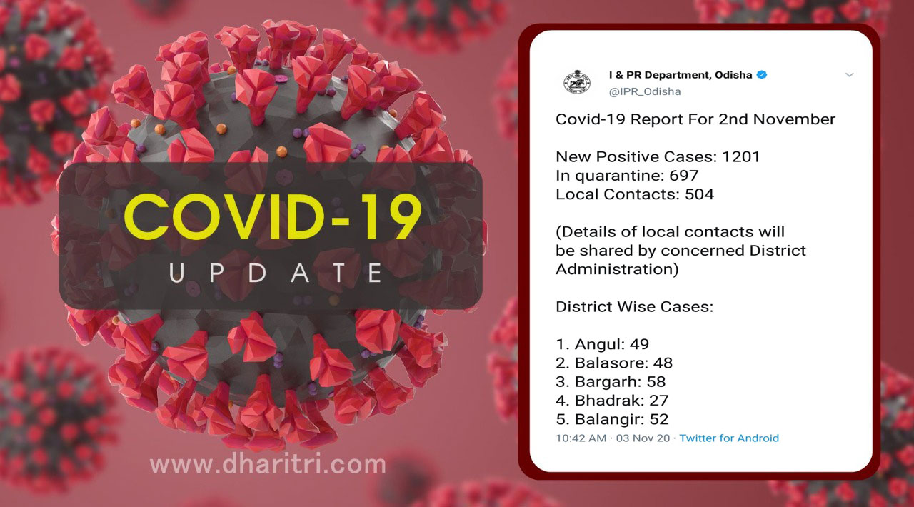 ଭୁବନେଶ୍ୱର,୩।୧୧(ବ୍ୟୁରୋ): ରାଜ୍ୟରେ ମଙ୍ଗଳବାର ୧୨୦୧ ନୂଆ କରୋନା ପଜିଟିଭ୍ ଚିହ୍ନଟ ହୋଇଛନ୍ତି। ଏହାକୁ ମିଶାଇ ରାଜ୍ୟରେ ମୋଟ୍ ଆକ୍ରାନ୍ତଙ୍କ ସଂଖ୍ୟା ୨୯୪୪୧୫କୁ ବୃଦ୍ଧି ପାଇଥିବା ରାଜ୍ୟ ସ୍ବାସ୍ଥ୍ୟ ଓ ପରିବାର କଲ୍ୟାଣ ବିଭାଗ ପକ୍ଷରୁ ସୂଚନା ମିଳିଛି। ଆକ୍ରାନ୍ତଙ୍କ ମଧ୍ୟରୁ ୬୯୭ ଜଣ କ୍ୱାରାଣ୍ଟାଇନ୍ ସେଣ୍ଟରରୁ ଚିହ୍ନଟ ହୋଇଥିବା ବେଳେ ୫୦୪ ଜଣ ସ୍ଥାନୀୟ ଅଞ୍ଚଳର ବୋଲି ଜଣାପଡ଼ିଛି। ସେଥିମଧ୍ୟରୁ ଖୋର୍ଦ୍ଧା ଜିଲାରୁ ସର୍ବାଧିକ ୧୩୨ ଆକ୍ରାନ୍ତ ଚିହ୍ନଟ ହୋଇଥିବା ବେଳେ ଅନୁଗୋଳରୁ ୪୯, ବାଲେଶ୍ୱରରୁ ୪୮, ବରଗଡ଼ରୁ ୫୮ , ଭଦ୍ରକରୁ ୨୭, ବଲାଙ୍ଗୀରରୁ ୫୨, ବୌଦ୍ଧରୁ ୮, କଟକରୁ ୬୯, ଦେବଗଡ଼ରୁ ୫, ଢେଙ୍କାନାଳରୁ ୧୪ , ଗଜପତିରୁ ୨ ଆକ୍ରାନ୍ତ ଚିହ୍ନଟ ହୋଇଛନ୍ତି। ସେହିଭଳି ଗଞ୍ଜାମରୁ ୬୧ ଜଗତ୍ସିଂହପୁରରୁ ୭୩, ଯାଜପୁରର୨୮ , ଝାରସୁଗୁଡ଼ାରୁ ୩୫, କଳାହାଣ୍ଡିରୁ ୨୬ , କନ୍ଧମାଳରୁ ୯, କେନ୍ଦ୍ରାପଡ଼ାରୁ ୪୩, କେନ୍ଦୁଝରରୁ ୩୨, କୋରାପୁଟରୁ ୨୮, ମାଲକାନଗିରିରୁ ୩୦, ମୟୂରଭଞ୍ଜରୁ ୭୩ ଆକ୍ରାନ୍ତ ରହିଛନ୍ତି। ଅନ୍ୟପକ୍ଷରେ ନବରଙ୍ଗପୁରରୁ ୨୪ , ନୟାଗଡ଼ରୁ ୧୪, ନୂଆପଡ଼ାରୁ ୫୭, ପୁରୀରୁ ୪୩, ରାୟଗଡ଼ାରୁ ୧୫, ସମ୍ବଲପୁରରୁ ୩୧, ସୁବର୍ଣ୍ଣପୁରରୁ ୨୪ ଓ ସୁନ୍ଦରଗଡ଼ର ୬୭ ଆକ୍ରାନ୍ତ ଅଛନ୍ତି।
