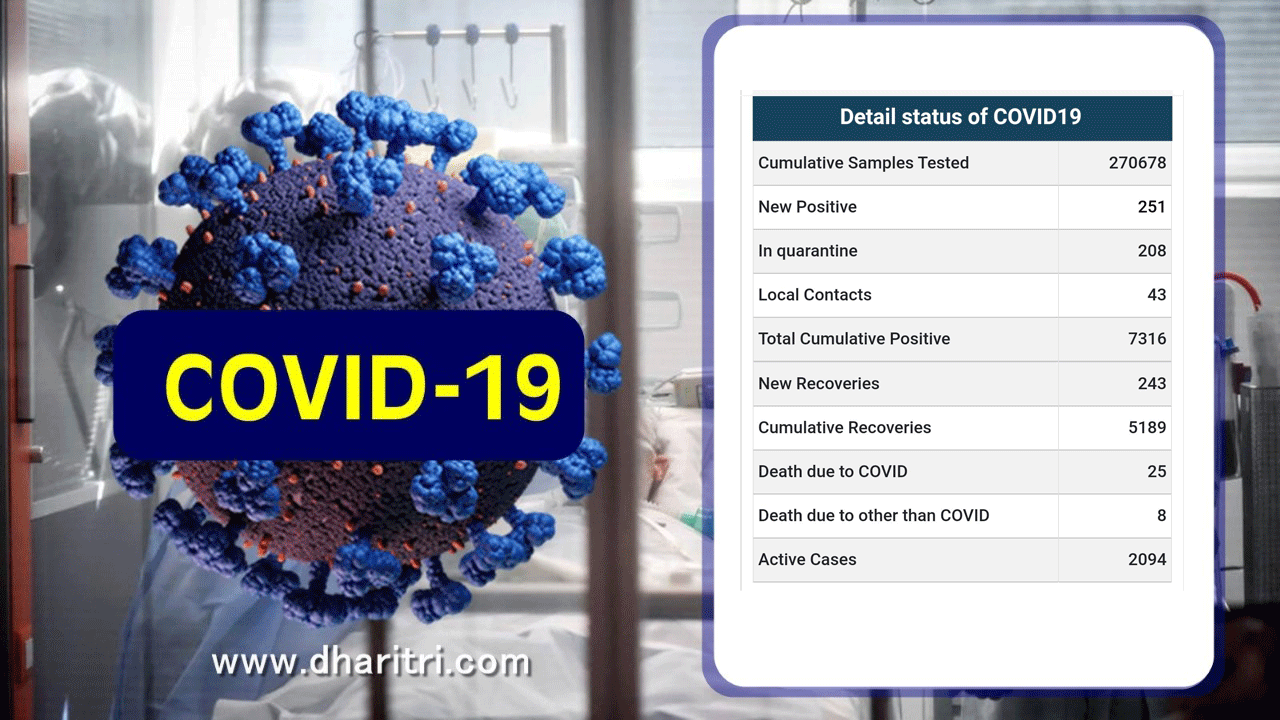 ଭୁବନେଶ୍ୱର, ୧।୭(ବ୍ୟୁରୋ): ରାଜ୍ୟରେ ବୁଧବାର ପୁଣି ୨୫୧ ଜଣ କରୋନା ପଜିଟିଭ ଚିହ୍ନଟ ହୋଇଛନ୍ତି। ଏହାକୁ ମିଶାଇ ରାଜ୍ୟରେ ମୋଟ ଆକ୍ରାନ୍ତଙ୍କ ସଂଖ୍ୟା ୭,୩୧୬ରେ ପହଞ୍ଚିଛି। ଏ ନେଇ ରାଜ୍ୟ ସୂଚନା ଓ ଲୋକ ସମ୍ପର୍କ ବିଭାଗ ପକ୍ଷରୁ ସୂଚନା ଦିଆଯାଇଛି। ତେବେ ନୂଆ ୨୫୧ ଆକ୍ରାନ୍ତଙ୍କ ମଧ୍ୟରୁ ୨୦୮ କ୍ୱାରାଣ୍ଟାଇନ ସେଣ୍ଟରରୁ ଚିହ୍ନଟ ହୋଇଥିବା ବେଳେ ୪୩ ଲୋକାଲ କେସ୍ ରହିଛି।