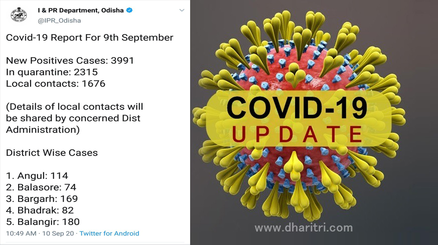 ଭୁବନେଶ୍ୱର,୧୦।୯(ବ୍ୟୁରୋ): ରାଜ୍ୟରେ ପୁଣି ୩୯୯୧ ଜଣ କରୋନା ଆକ୍ରାନ୍ତ ଚିହ୍ନଟ ହୋଇଛନ୍ତି। ସେମାନଙ୍କ ମଧ୍ୟରୁ ୨୩୧୫ କ୍ୱାରାଣ୍ଟାଇନ୍ରୁ ଚିହ୍ନଟ ହୋଇଥିବାବେଳେ ୧୬୭୬ଜଣ ଲୋକାଲ କେସ୍ ଥିବା ରାଜ୍ୟ ସୂଚନା ଏବଂ ଲୋକସମ୍ପର୍କ ବିଭାଗ ପକ୍ଷରୁ ଟୁଇଟ୍ ଯୋଗେ ସୂଚନା ଦିଆଯାଇଛି। ଏହାକୁ ମିଶାଇ ରାଜ୍ୟରେ ମୋଟ ୧ ଲକ୍ଷ ୩୯ ହଜାର ୧୨୧ ଜଣରେ ପହଞ୍ଚିଛି। ଗୁରୁବାର ଚିହ୍ନଟ ଆକ୍ରାନ୍ତଙ୍କ ମଧ୍ୟରେ ଖୋର୍ଦ୍ଧା ଜିଲାରୁ ସର୍ବାଧିକ ୬୮୭ ଜଣ ଥିବା ଜଣାପଡିଛି। ସେହିପରି କଟକ ୩୯୨, ମୟୁରଭଞ୍ଜ ୧୬୦, ବରଗଡ ୧୬୯, ଭଦ୍ରକ ୮୨, ବାଲେଶ୍ୱର ୭୪, ଯାଜପୁର ୧୪୮, ରାୟଗଡାରୁ ୫୮, ନବରଙ୍ଗପୁର ୧୨୫, କେନ୍ଦ୍ରାପଡା ୧୪୭ କୋରାପୁଟ ୧୨୭, ଜଗତସିଂହପୁର ୧୦୯, ଢେଙ୍କାନାଳରୁ ୧୦୧ ଜଣ ଆକ୍ରାନ୍ତ ଚିହ୍ନଟ ହୋଇଛନ୍ତି।