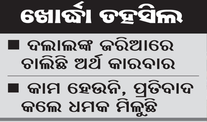 ଖୋର୍ଦ୍ଧା ଅଫିସ,୧୨।୧୦: ଖୋର୍ଦ୍ଧା ତହସିଲ କାର୍ଯ୍ୟାଳୟ ଦୁର୍ନୀତିରେ ବୁଡିଛି। କାର୍ଯ୍ୟାଳୟରେ ଦଲାଲ ସକ୍ରିୟ ରହିଛନ୍ତି। କାର୍ଯ୍ୟାଳୟର କେତେଜଣ ଅସାଧୁ କର୍ମଚାରୀ ଏବଂ ଦଲାଲଙ୍କ ମଧୁଚନ୍ଦ୍ରିକାରେ ଚାଲିଛି କାର୍ଯ୍ୟ। ଫଳରେ ଜମିଜମା ପଟ୍ଟା, ଅନ୍ୟାନ୍ୟ କାମରେ ଆସୁଥିବା ଲୋକେ ନାହିଁ ନ ଥିବା ଅସୁବିଧାର ସମ୍ମୁଖୀନ ହେଉଛନ୍ତି। ଦାବି ମୁତାବକ ଲାଞ୍ଚ ନ ଦେଲେ କାର୍ଯ୍ୟ ହୋଇପାରିବ ନାହିଁ ବୋଲି ଦଲାଲଙ୍କ ଜରିଆରେ କହୁଛନ୍ତି। ଏଭଳି ଅଭିଯୋଗ ଆଣିଛନ୍ତି ଖୋର୍ଦ୍ଧାର କେତେଜଣ ସଚେତନ ନାଗରିକ। ଖୋର୍ଦ୍ଧା ତହସିଲ କାର୍ଯ୍ୟାଳୟକୁ ତଦନ୍ତ ପରିସରଭୁକ୍ତ କରି ସାଧାରଣ ଲୋକଙ୍କୁ ନ୍ୟାୟ ଦାବିରେ ମଙ୍ଗଳବାର ଶତାଧିକ ଖୋର୍ଦ୍ଧା ବାସିନ୍ଦାଙ୍କ ଦସ୍ତଖତ ସମ୍ବଳିତ ଏକ ଦାବିପତ୍ର ଜିଲାପାଳଙ୍କ ଅନୁପସ୍ଥିତିରେ ଅତିରିକ୍ତ ଜିଲାପାଳ(ରାଜସ୍ବ) ସାଫଲ୍ୟ ମଣ୍ଡିତ ପ୍ରଧାନଙ୍କୁ ପ୍ରଦାନ କରିଛନ୍ତି।