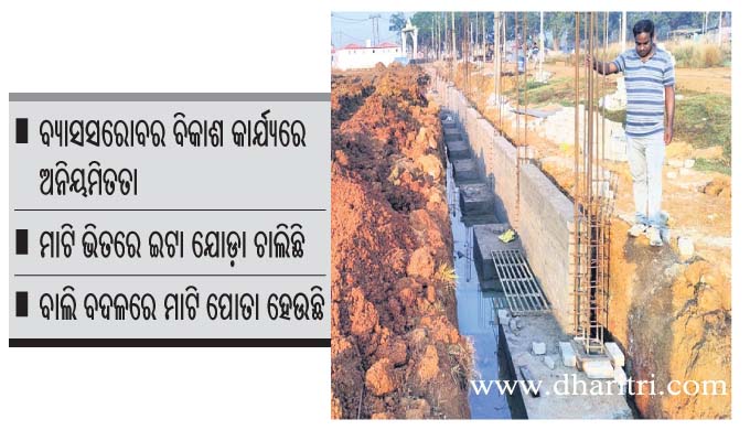 ଯାଜପୁର ଅଫିସ,୭ା୩: ଦୀର୍ଘବର୍ଷ ଧରି ଅବହେଳିତ ଅବସ୍ଥାରେ ପଡ଼ି ରହିଥିବା ଯାଜପୁର ଜିଲା ବ୍ୟାସନଗରସ୍ଥିତ ଅନ୍ୟତମ ପର୍ଯ୍ୟଟନସ୍ଥଳୀ ବ୍ୟାସସରୋବର ବିକାଶ କାମ ଆରମ୍ଭ ହୋଇଛି। ଏଥିପାଇଁ ରାଜ୍ୟ ସରକାର ୬୪ କୋଟି ଟଙ୍କା ମଞ୍ଜୁର କରିଛନ୍ତି। ଏନ୍ବିସିସି (ନ୍ୟାଶନାଲ ବିଲ୍ଡିଂ କନଷ୍ଟ୍ରକ୍ସନ କର୍ପୋରେଶନ) ଜରିଆରେ ଦିଲ୍ଲୀର ଠିକାସଂସ୍ଥା କ୍ରିଷ୍ଣା ବିଲ୍ଡର ଏହି କାମ କରୁଛି ା ତେବେ ଏହି କାମ ଆରମ୍ଭରୁ ଅନେକ ଅନିୟମିତତା ସାମ୍ନାକୁ ଆସିଛି। ପାଚେରି ନିର୍ମାଣ କାମ ବିଭାଗୀୟ ଅଟକଳ ଓ ଡିଜାଇନ ଅନୁଯାୟୀ ହେଉ ନ ଥିବା ଅଭିଯୋଗ ହେଉଛି। ଏଥିଯୋଗୁ ଏହି ପର୍ଯ୍ୟଟନସ୍ଥଳୀର ଦୀର୍ଘସ୍ଥାୟିତ୍ୱ ନେଇ ସାଧାରଣରେ ପ୍ରଶ୍ନବାଚୀ ସୃଷ୍ଟି କରିଛି।