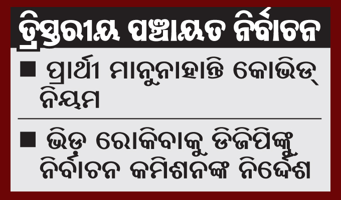 ପ୍ରାର୍ଥୀଙ୍କ ସହ ସମର୍ଥକମାନେ ନାମାଙ୍କନ କେନ୍ଦ୍ରରେ ଭିଡ଼ କରୁଥିବାର ଦୃଶ୍ୟ ପ୍ରତ୍ୟେକ ଦିନ ସାମ୍ନାକୁ ଆସୁଛି। ନିର୍ବାଚନ ପରିଚାଳନା ନେଇ ଜାନୁୟାରୀ ୧୫ ତାରିଖରେ ଏସ୍ପି ଓ ଜିଲାପାଳଙ୍କ ସହ ନିର୍ବାଚନ କମିଶନର ବୈଠକ କରିଥିଲେ। ଜଣେ ଡିଏସ୍ପି ପାହ୍ୟାର ପୋଲିସ ଅଧିକାରୀଙ୍କୁ କୋଭିଡ୍ ପର୍ଯ୍ୟବେକ୍ଷକ ଭାବେ ନିଯୁକ୍ତି ଦିଆଯିବ। ପ୍ରାର୍ଥତ୍ପତ୍ର ଦାଖଲ ବେଳେ ଏବଂ ନିର୍ବାଚନ ସଭା ଅନୁଷ୍ଠିତ ବେଳେ ଭିଡ଼କୁ ନିୟନ୍ତ୍ରଣ କରିବା ସହ କୋଭିଡ୍-୧୯ ନିୟମକୁ କଡ଼ାକଡ଼ି ପାଳନ କରିବାକୁ କମିଶନର ନିର୍ଦ୍ଦେଶ ଦେଇଥିଲେ। ଶେଷ ଦିନରେ ସର୍ବାଧିକ ପ୍ରାର୍ଥୀ ନାମାଙ୍କନ ଦାଖଲ କରିବା ସମ୍ଭାବନା ରହିଛି। ଏହାକୁ ଦୃଷ୍ଟିରେ ରଖି ଯେମିତି ଭିଡ଼ ନ ହେବ ଓ ଗାଇଡ୍ଲାଇନ ଉଲ୍ଲଂଘନ ନ ହେବ ସେଥିପ୍ରତି ଦୃଷ୍ଟିଦେବାକୁ କମିଶନ ନିର୍ଦ୍ଦେଶ ଦେଇଛନ୍ତି।
