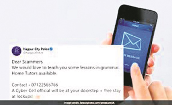 ସାଇବର ଅପରାଧୀଙ୍କ ଉଦ୍ଦେଶ୍ୟରେ ନାଗପୁର ପୋଲିସ୍ ଏକ ଟୁଇଟ୍ କରି କହିଛି ଯେ, ”ହେ ସ୍କାମରମାନେ, ଆମେ ତୁମକୁ ଗ୍ରାମାର ପଢାଇବାକୁ ଚାହୁଁଛୁ।“ ଏହାପରେ ପୋଲିସ୍ ଏକ ହେଲ୍ପ ଲାଇନ୍ ନମ୍ବର ଦେଇ କହିଛି କି, ଏହି ନମ୍ବରରେ ଫୋନ୍ କଲେ ସାଇବର ସେଲ୍ ଅଫିସରମାନେ ତୁମ ଘର ପାଖରେ ପହଞ୍ଚିଯିବେ ଏବଂ ସେମାନେ ମାଗଣାରେ ଲକ୍ଅପ୍ରେ ରଖିଦେବେ। ପୋଲିସ୍ର ଏମିତି ଏକ ମଜାଦାର ଢଙ୍ଗରେ ଟୁଇଟ୍ କରିବା ଏବେ ଲୋକଙ୍କ ମଧ୍ୟରେ ଚର୍ଚ୍ଚାର କାରଣ ହୋଇଛି। ପୋଲିସର ଏହି ଟୁଇଟ୍ ଏବେ ସୋସିଆଲ୍ ମିଡିଆରେ ଭାଇରାଲ୍ ହେବାରେ ଲାଗିଛି। ବହୁସଂଖ୍ୟାରେ ଲୋକେ ଏହି ଟୁଇଟ୍କୁ ଲାଇକ୍ କରିବା ସହିତ ଶେୟାର ବି କରୁଛନ୍ତି। ପୋଲିସ୍କୁ ମଧ୍ୟ ଲୋକେ ସୁନ୍ଦର କମେଣ୍ଟ ଦେଉଛନ୍ତି। କିଛି ଲୋକ ତ ପୋଲିସର ଏଭଳି ପଦକ୍ଷେପ ନେଇ ଆଶ୍ଚର୍ଯ୍ୟ ହେବା ସହିତ ପ୍ରଶଂସା କରିଛନ୍ତି।