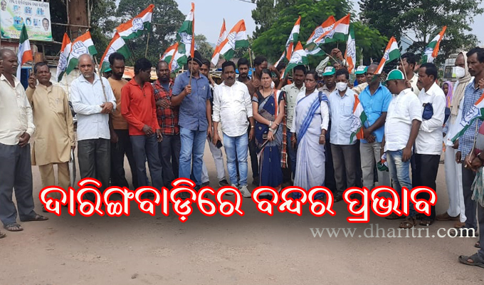 ଦାରିଙ୍ଗବାଡ଼ି,୧୧ା୧୦(ଡି.ଏନ୍.ଏ.): କନ୍ଧମାଳ ଜିଲା ଦାରିଙ୍ଗବାଡ଼ି ବ୍ଲକ କଂଗ୍ରେସ ପକ୍ଷରୁ ବିଭିନ୍ନ ଦାବି ନେଇ ଦାରିଙ୍ଗବାଡ଼ି ବନ୍ଦ ଡାକରା ଦିଆଯାଇଛି। ସୋମବାର ସକାଳ ୭ଟାରୁ ଦଳ ପକ୍ଷରୁ ବିଭିନ୍ନ ଛକରେ ଗାଡ଼ିମୋଟର ବନ୍ଦ କରିବା ସହ ସମସ୍ତ ଦୋକାନ ବଜାର ବନ୍ଦ ରହିଛି। ଫଳରେ ଦାରିଙ୍ଗବାଡି ଠାରୁ ବ୍ରାହ୍ମଣୀଗାଁ,ବ୍ରହ୍ମପୁର,ଭଞ୍ଜନଗର,ଫୁଲବାଣୀ ଆଦି ଅଞ୍ଚଳକୁ ଗାଡ଼ିମୋଟର ବନ୍ଦ ରହିଛି।