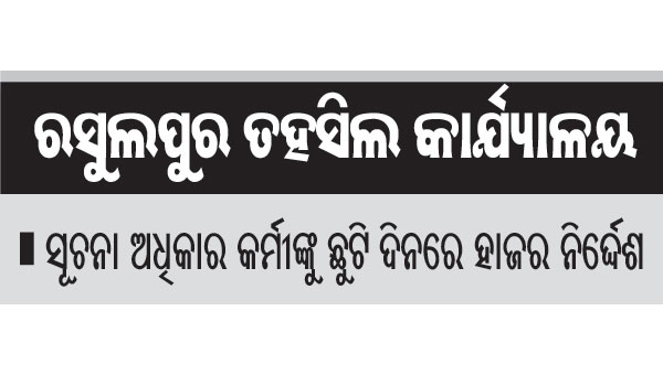 ରସୁଲପୁର,୨୧ା୧(ଡି.ଏନ.ଏ.): ରସୁଲପୁର ତହସିଲ କାର୍ଯ୍ୟାଳୟରେ ସୂଚନା ଅଧିକାର ଆଇନ-୨୦୦୫କୁ ଉଲ୍ଲଂଘନ କରାଯାଉଛି। ଏହି ଆଇନକୁ ତହସିଲଦାର ନିରଞ୍ଜନ ସାହୁ ଠିକ ଭାବରେ ଅନୁପାଳନ କରୁନାହାନ୍ତି। ସୂଚନା ଅଧିକାର କର୍ମୀଙ୍କୁ ନିର୍ଦ୍ଧାରିତ ସମୟ ସୀମା ଭିତରେ ସୂଚନା ପ୍ରଦାନ କରୁ ନ ଥିବା ଅଭିଯୋଗ ହେଉଛି। ନିୟମାନୁଯାୟୀ କର୍ମୀ ଜନ ସୂଚନା ଅଧିକାରୀଙ୍କ ତଥ୍ୟ ପ୍ରଦାନରେ ଅବହେଳା କରିଥିବା ଦର୍ଶାଇ ଉପରିସ୍ଥ ଅଧିକାରୀ(ଅପିଲେଟ ଅଥରିଟି)ଙ୍କ ନିକଟରେ ଅଭିଯୋଗ କରିଥିଲେ। ଅଭିଯୋଗ ପରେ ବି ସୂଚନା ଅଧିକାର କର୍ମୀଙ୍କୁ ତଥ୍ୟ ମିଳି ପାରୁନାହିଁ। ତେଣୁ ଜନ ଶୁଣାଣି ପାଇଁ ଆବେଦନକାରୀଙ୍କୁ ଛୁଟି ଦିନରେ ନୋଟିସ ଜରିଆରେ ତହସିଲରେ ହାଜର ହେବାକୁ ନିର୍ଦ୍ଦେଶ ଦିଆଯାଉଛି। ଉକ୍ତ ନିର୍ଦ୍ଦେଶ ମୁତାବକ ତହସିଲରେ ହାଜର ହୋଇ କାର୍ଯ୍ୟାଳୟରେ ତାଲା ଝୁଲୁ ଥିବା ଦେଖି ଆବେଦନକାରୀ ନିରାଶ ହୋଇ ଫେରି ଯାଉଛନ୍ତି। ଏଭଳି ଘଟଣା ଘଟିଛି ସୂଚନା ଅଧିକାର କର୍ମୀ ଯାଜପୁର ବ୍ଲକ ଝାଲପଡ଼ା ପଞ୍ଚାୟତର ପ୍ରକାଶ ଚନ୍ଦ୍ର ସାହୁଙ୍କ କ୍ଷେତ୍ରରେ।