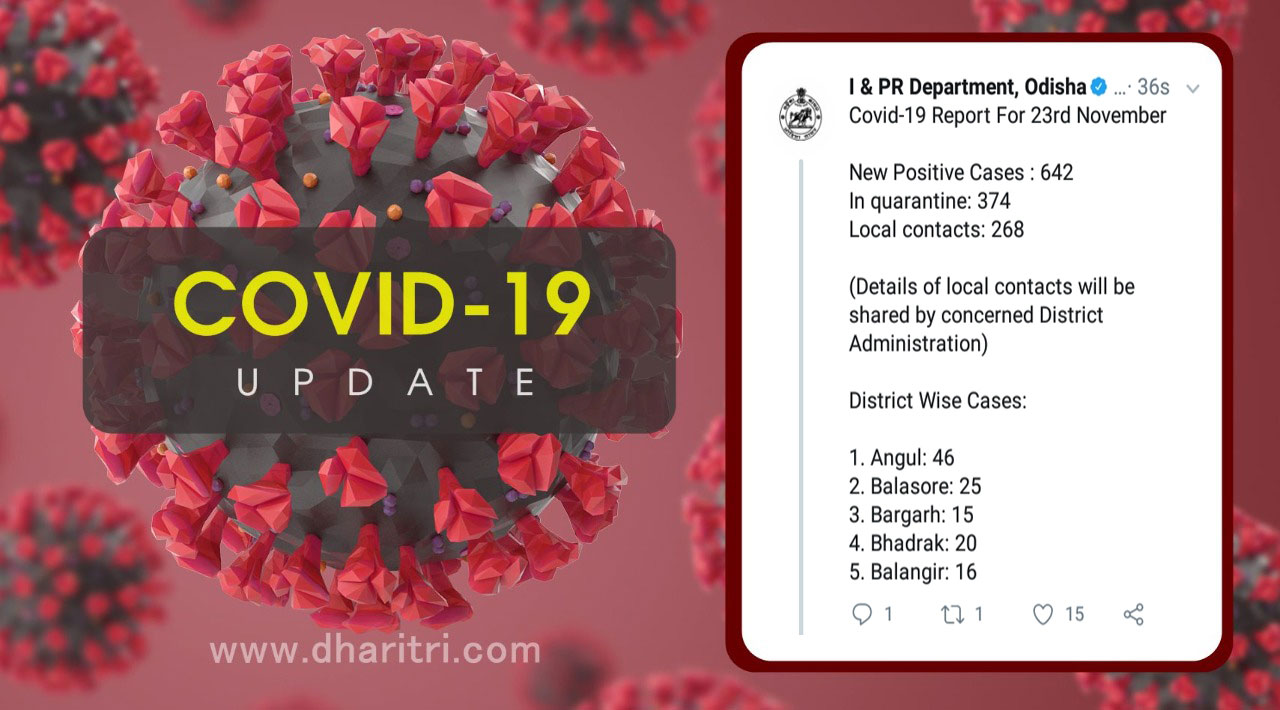 ଭୁବନେଶ୍ୱର,୨୪।୧୧(ବ୍ୟୁରୋ): ରାଜ୍ୟରେ ମଙ୍ଗଳବାର ୬୪୨ ନୂଆ କରୋନା ପଜିଟିଭ୍ ଚିହ୍ନଟ ହୋଇଛନ୍ତି। ଏହାକୁ ମିଶାଇ ରାଜ୍ୟରେ ମୋଟ୍ ଆକ୍ରାନ୍ତଙ୍କ ସଂଖ୍ୟା ୩୧୫୨୭୧କୁ ବୃଦ୍ଧି ପାଇଥିବା ରାଜ୍ୟ ସ୍ବାସ୍ଥ୍ୟ ଓ ପରିବାର କଲ୍ୟାଣ ବିଭାଗ ପକ୍ଷରୁ ସୂଚନା ମିଳିଛି। ଆକ୍ରାନ୍ତଙ୍କ ମଧ୍ୟରୁ ୩୭୪ ଜଣ କ୍ୱାରାଣ୍ଟାଇନ୍ ସେଣ୍ଟରରୁ ଚିହ୍ନଟ ହୋଇଥିବା ବେଳେ ୨୬୮ ଜଣ ସ୍ଥାନୀୟ ଅଞ୍ଚଳର ବୋଲି ଜଣାପଡ଼ିଛି। ସେଥିମଧ୍ୟରୁ ସର୍ବାଧିକ ୭୦ ଆକ୍ରାନ୍ତ କେନ୍ଦୁଝର ଜିଲାରୁ ଚିହ୍ନଟ ହୋଇଥିବା ବେଳେ ଅନୁଗୋଳରୁ ୪୬, ବାଲେଶ୍ୱରରୁ ୨୫, ବରଗଡ଼ରୁ ୧୫ , ଭଦ୍ରକରୁ ୨୦, ବଲାଙ୍ଗୀରରୁ ୧୬, ବୌଦ୍ଧରୁ ୩, କଟକରୁ ୨୬ , ଦେବଗଡ଼ରୁ ୪, ଢେଙ୍କାନାଳରୁ ୧୬, ଗଜପତିରୁ ୨ ଓ ଗଞ୍ଜାମରୁ ୬ ଆକ୍ରାନ୍ତ ଚିହ୍ନଟ ହୋଇଛନ୍ତି। ସେହିଭଳି ଜଗତ୍ସିଂହପୁରରୁ ୧୮, ଯାଜପୁରର ୧୫ , ଝାରସୁଗୁଡ଼ାରୁ ୨୧, କଳାହାଣ୍ଡିରୁ ୭ , କନ୍ଧମାଳରୁ ୩, କେନ୍ଦ୍ରାପଡ଼ାରୁ ୧୬, କୋରାପୁଟରୁ ୧୦, ମାଲକାନଗିରିରୁ ୪, ମୟୂରଭଞ୍ଜରୁ ୪୧ ଆକ୍ରାନ୍ତ ରହିଛନ୍ତି। ଅନ୍ୟପକ୍ଷରେ ନବରଙ୍ଗପୁରରୁ ୪ , ନୟାଗଡ଼ରୁ ୨, ନୂଆପଡ଼ାରୁ ୬୯, ପୁରୀରୁ ୧୭, ରାୟଗଡ଼ାରୁ ୫, ସମ୍ବଲପୁରରୁ ୧୯ ଓ ସୁବର୍ଣ୍ଣପୁରରୁ ୨ ଓ ସୁନ୍ଦରଗଡ଼ରୁ ୬୬ ଆକ୍ରାନ୍ତ ଅଛନ୍ତି।