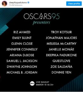 ମୁମ୍ବାଇ: ବଲିଉଡ ନାୟିକା ଦୀପିକା ପାଦୁକୋନ ଗୋଟିଏ ପରେ ଗୋଟିଏ ହିଟ୍ ମୁଭି ଦେଇ ଦର୍ଶକଙ୍କ ମନ କିଣିଥିବା ବେଳେ ଅନ୍ତରାଷ୍ଟ୍ରୀୟ ମଞ୍ଚରେ ବି ଦେଶକୁ ପ୍ରାଉଡ ଫିଲ କରାଉଛନ୍ତି । ପୁଣିଥରେ ଅଭିନେତ୍ରୀ ଦେଶକୁ ଗର୍ବ କରିବାର ମୌକା ଦେଇଛନ୍ତି । କଥା ହେଲା ଦୀପିକା ପାଦୁକୋନ ଓସ୍କାର ୨୦୨୩ରେ ପ୍ରେଜେଣ୍ଟର ଭାବେ ନଜର ଆସିବେ । ଗୁରୁବାର ରାତିରେ ଦୀପିକା ଇନଷ୍ଟାଗ୍ରାମରେ ସମସ୍ତ ପ୍ରେଜେଣ୍ଟରଙ୍କ ନାମ ସହ ଏକ ପୋଷ୍ଟ ଶେୟାର କରିଛନ୍ତି ।